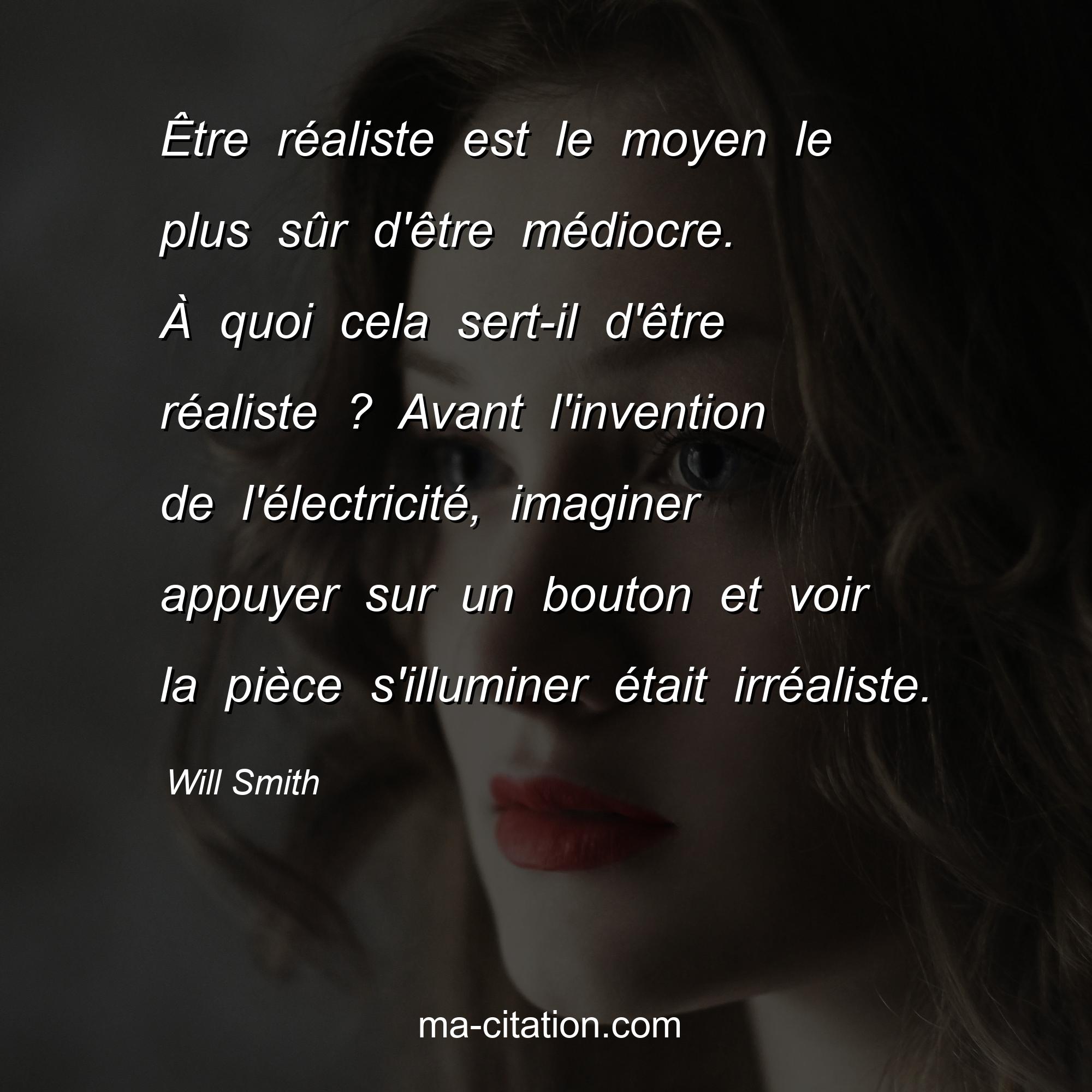 Citation sur la motivation de Will Smith :Être réaliste est le moyen le plus sûr d'être médiocre. À quoi cela sert-il d'être réaliste ? Avant l'invention de l'électricité, imaginer appuyer sur un bouton et voir la pièce s'illuminer était irréaliste.
