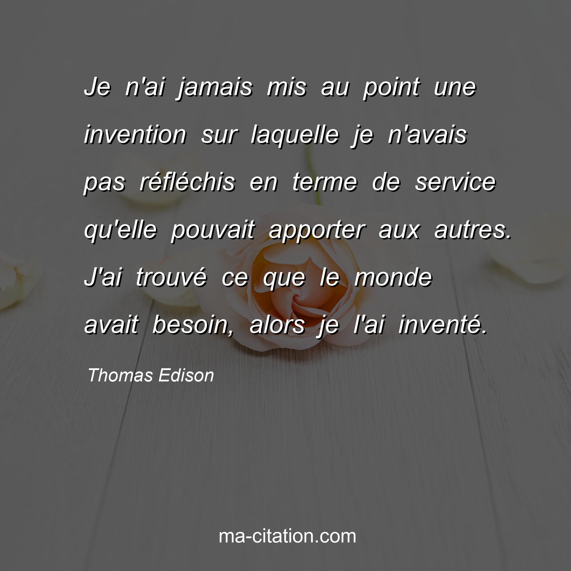 Citation sur la motivation de Thomas Edison :Je n'ai jamais mis au point une invention sur laquelle je n'avais pas réfléchis en terme de service qu'elle pouvait apporter aux autres. J'ai trouvé ce que le monde avait besoin, alors je l'ai inventé.