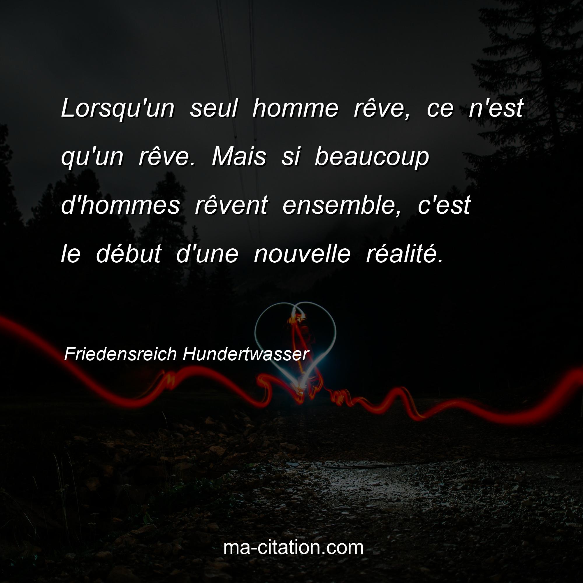 Friedensreich Hundertwasser est l'auteur de la citation sur la motivation "Lorsqu'un seul homme rêve, ce n'est qu'un rêve. Mais si beaucoup d'hommes rêvent ensemble, c'est le début d'une nouvelle réalité.