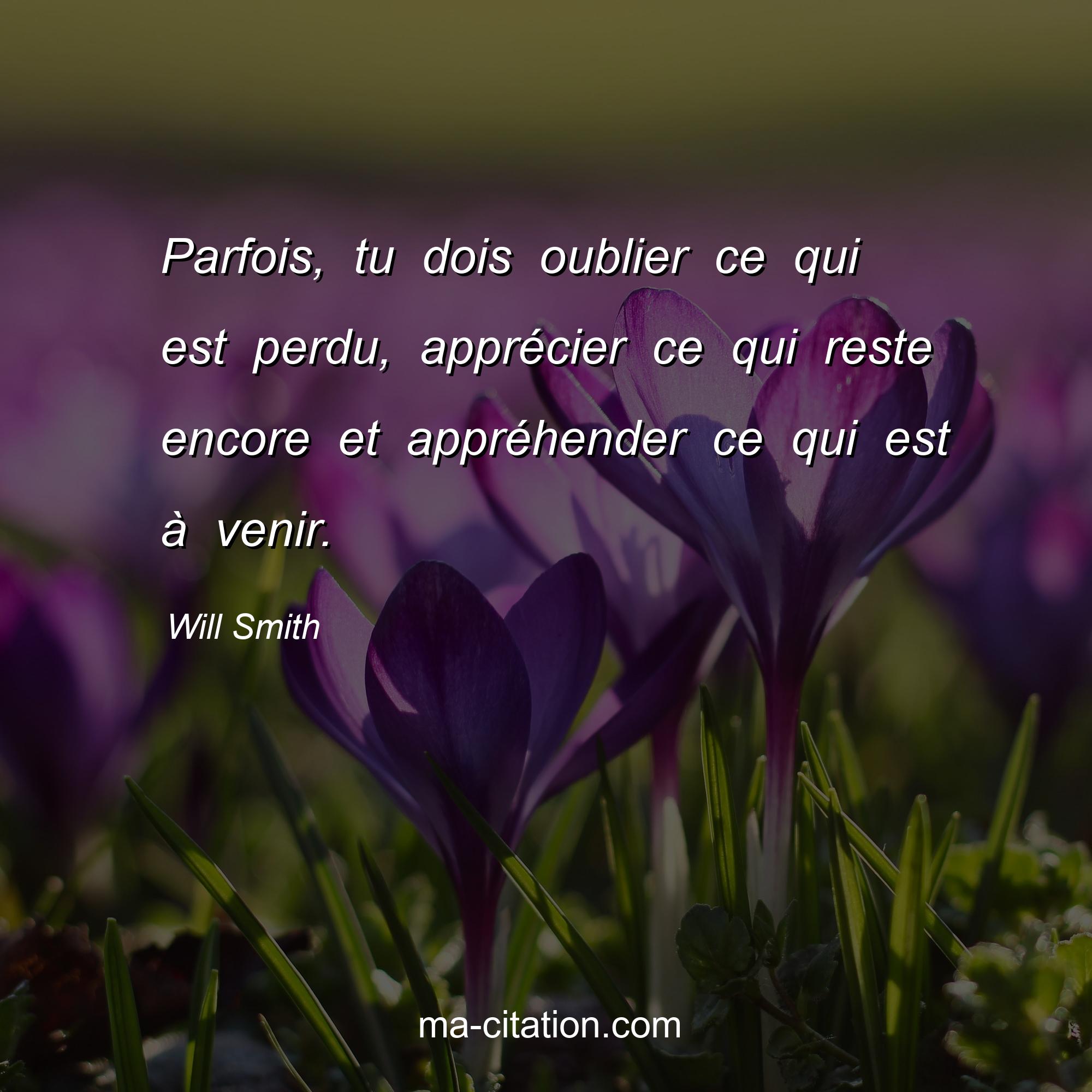 Citation sur la motivation de Will Smith :Parfois, tu dois oublier ce qui est perdu, apprécier ce qui reste encore et appréhender ce qui est à venir.