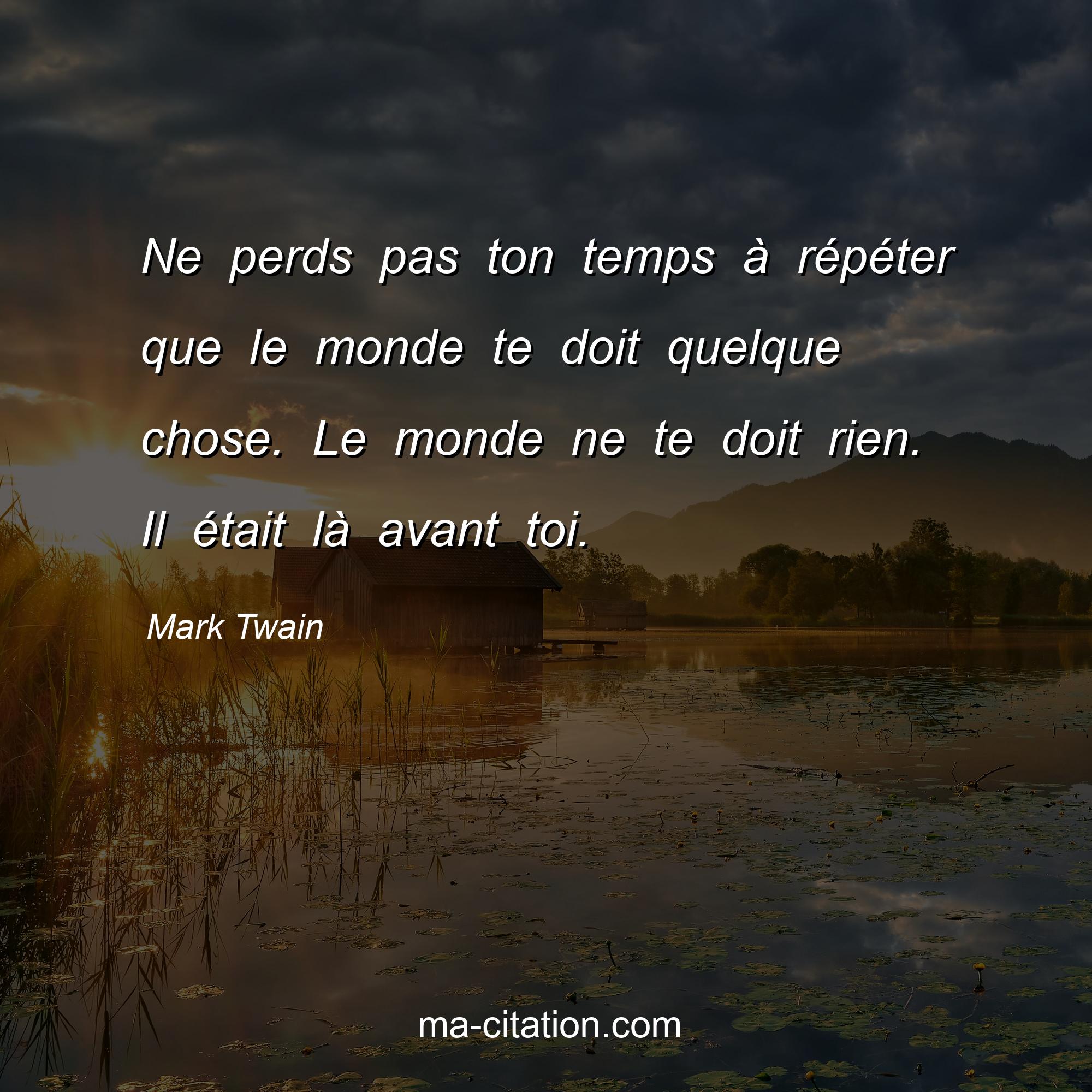 Citation sur la motivation de Mark Twain :Ne perds pas ton temps à répéter que le monde te doit quelque chose. Le monde ne te doit rien. Il était là avant toi.