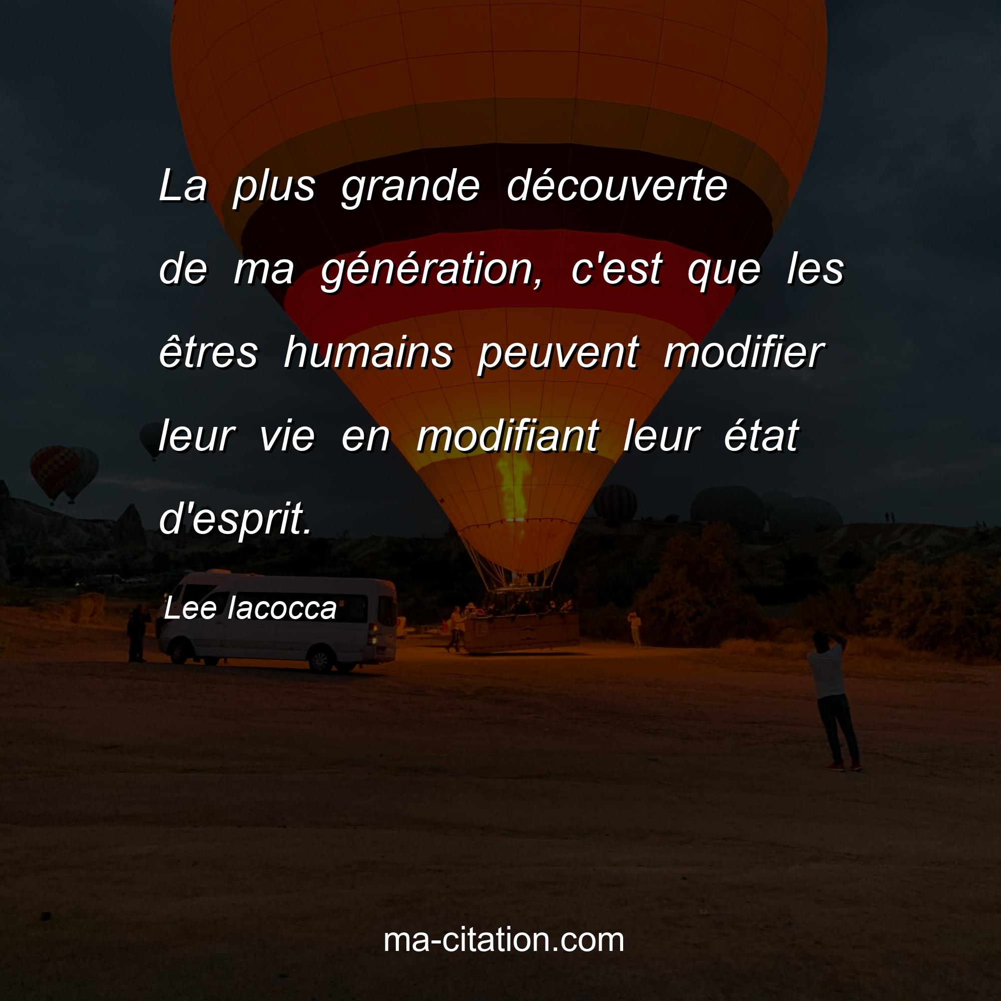 Citation sur la motivation de Lee Iacocca :La plus grande découverte de ma génération, c'est que les êtres humains peuvent modifier leur vie en modifiant leur état d'esprit.