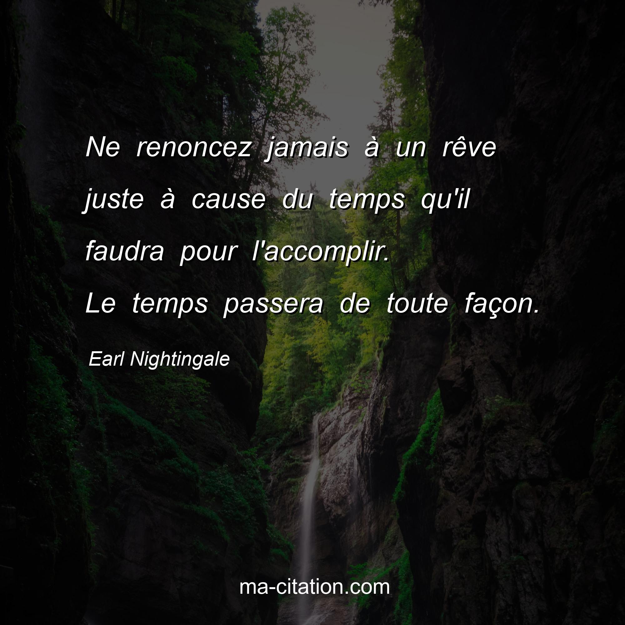 Citation sur la motivation d'Earl Nightingale :Ne renoncez jamais à un rêve juste à cause du temps qu'il faudra pour l'accomplir. Le temps passera de toute façon.
