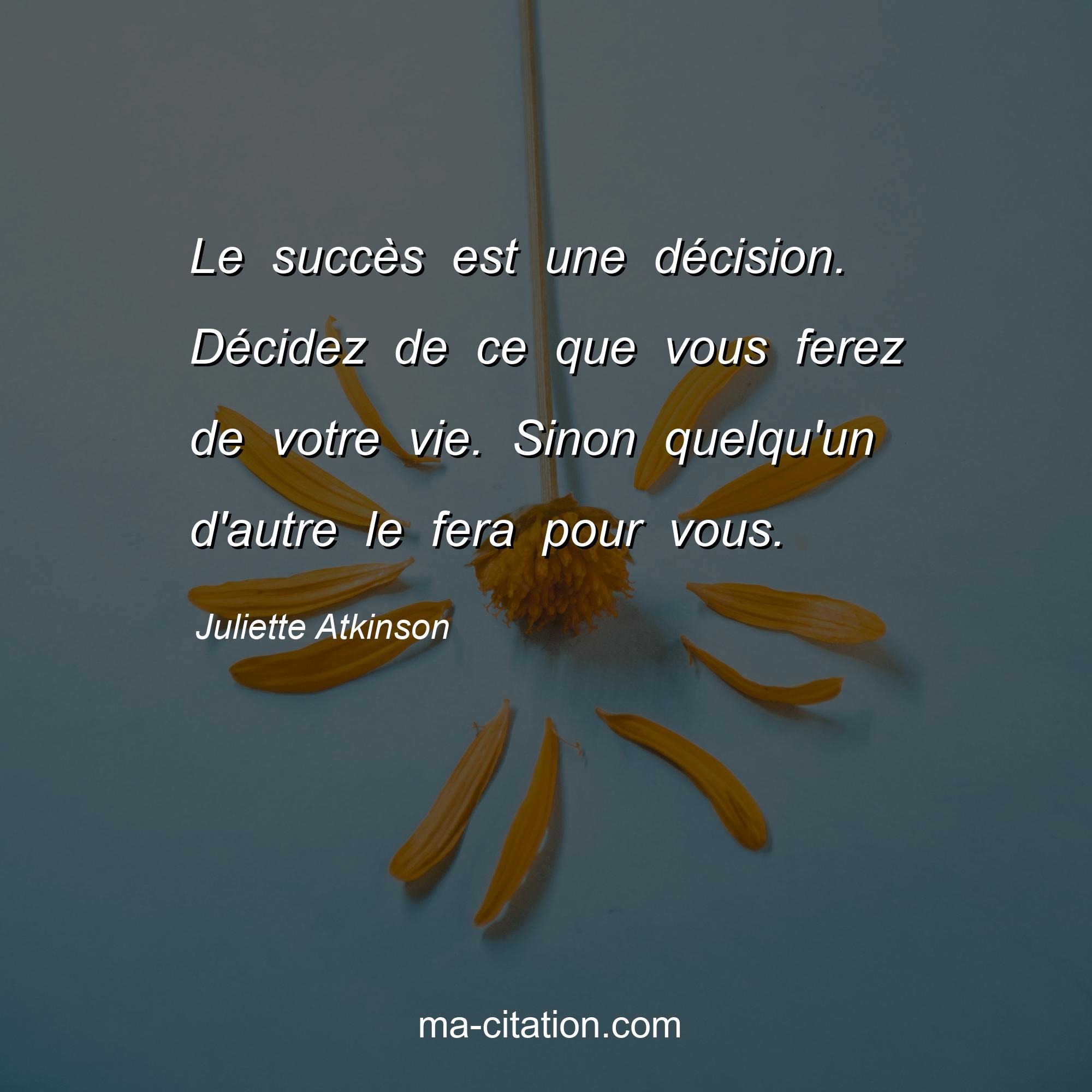 Citation sur la motivation de Juliette Atkinson :Le succès est une décision. Décidez de ce que vous ferez de votre vie. Sinon quelqu'un d'autre le fera pour vous.