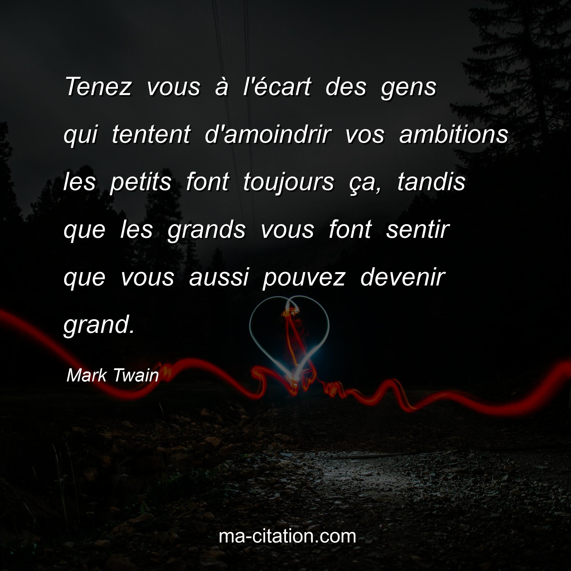 Citation sur la motivation de Mark Twain :Tenez vous à l'écart des gens qui tentent d'amoindrir vos ambitions les petits font toujours ça, tandis que les grands vous font sentir que vous aussi pouvez devenir grand.