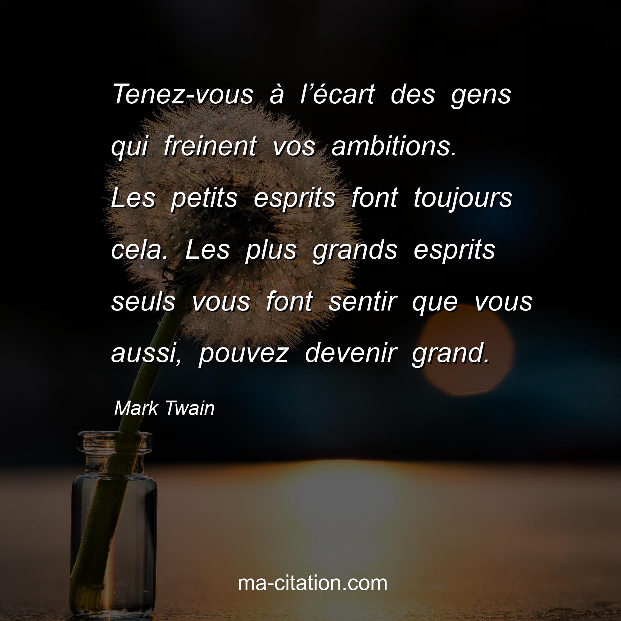Citation sur la motivation de Mark Twain :Tenez-vous à l’écart des gens qui freinent vos ambitions. Les petits esprits font toujours cela. Les plus grands esprits seuls vous font sentir que vous aussi, pouvez devenir grand.