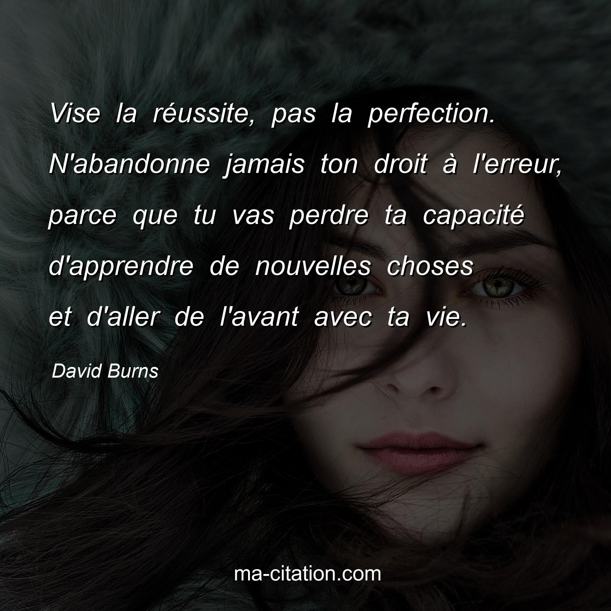Citation sur la motivation de David Burns :Vise la réussite, pas la perfection. N'abandonne jamais ton droit à l'erreur, parce que tu vas perdre ta capacité d'apprendre de nouvelles choses et d'aller de l'avant avec ta vie.