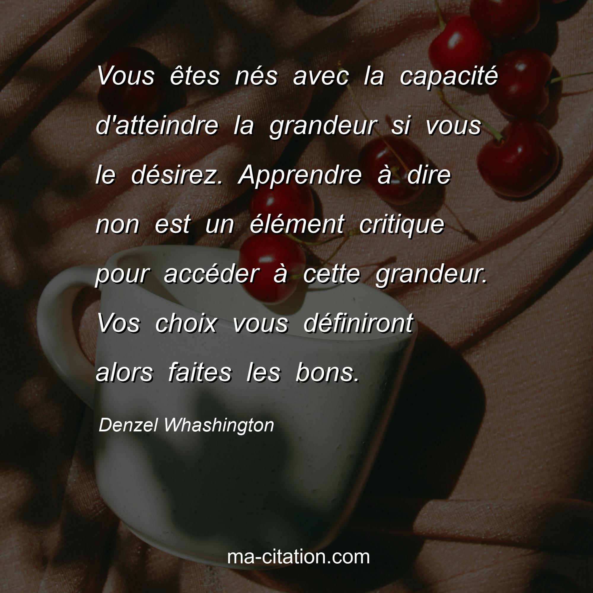 Citation sur la motivation de Denzel Whashington :Vous êtes nés avec la capacité d'atteindre la grandeur si vous le désirez. Apprendre à dire non est un élément critique pour accéder à cette grandeur. Vos choix vous définiront alors faites les bons.