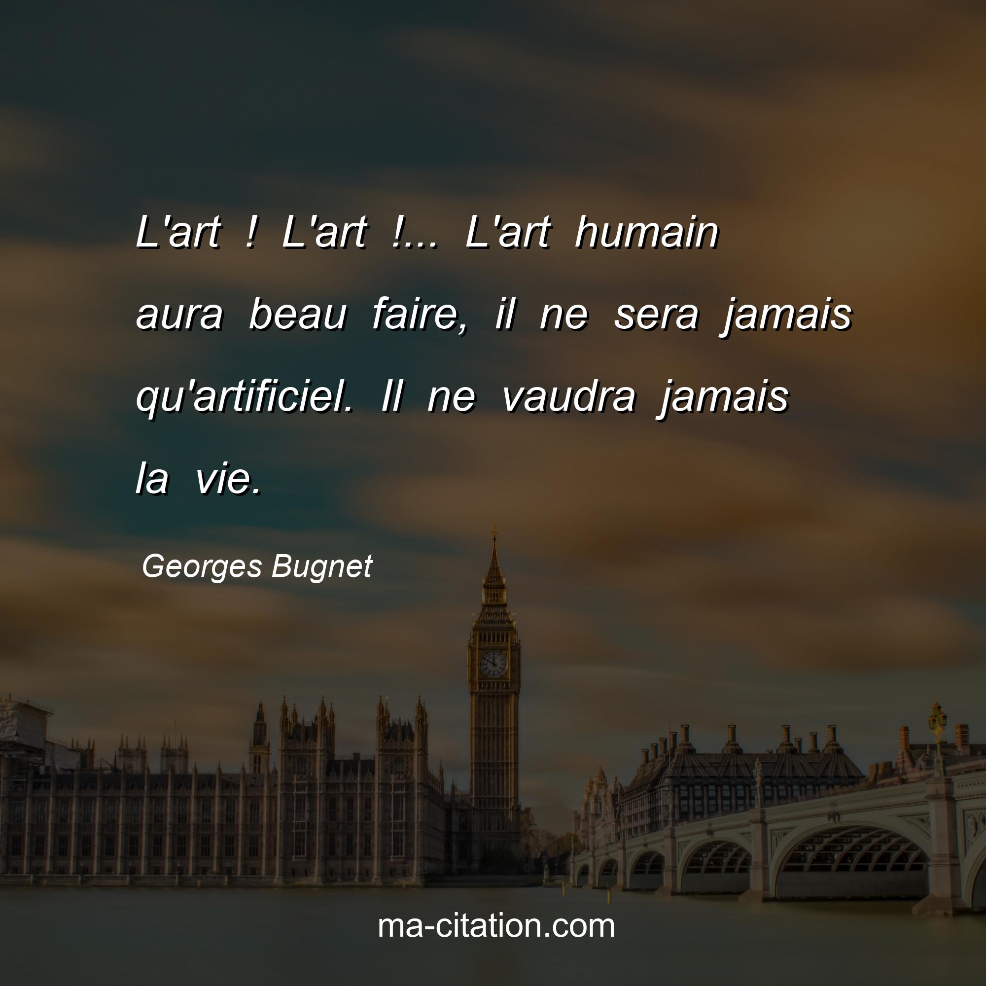 Citation sur la vie de Georges Bugnet :L'art ! L'art !... L'art humain aura beau faire, il ne sera jamais qu'artificiel. Il ne vaudra jamais la vie.