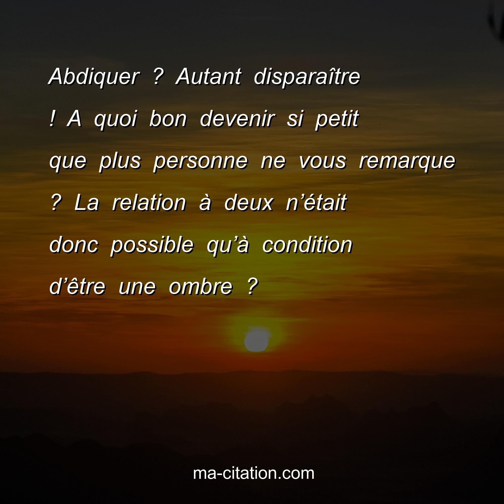 Citation sur la vie :Abdiquer ? Autant disparaître ! A quoi bon devenir si petit que plus personne ne vous remarque ? La relation à deux n’était donc possible qu’à condition d’être une ombre ?