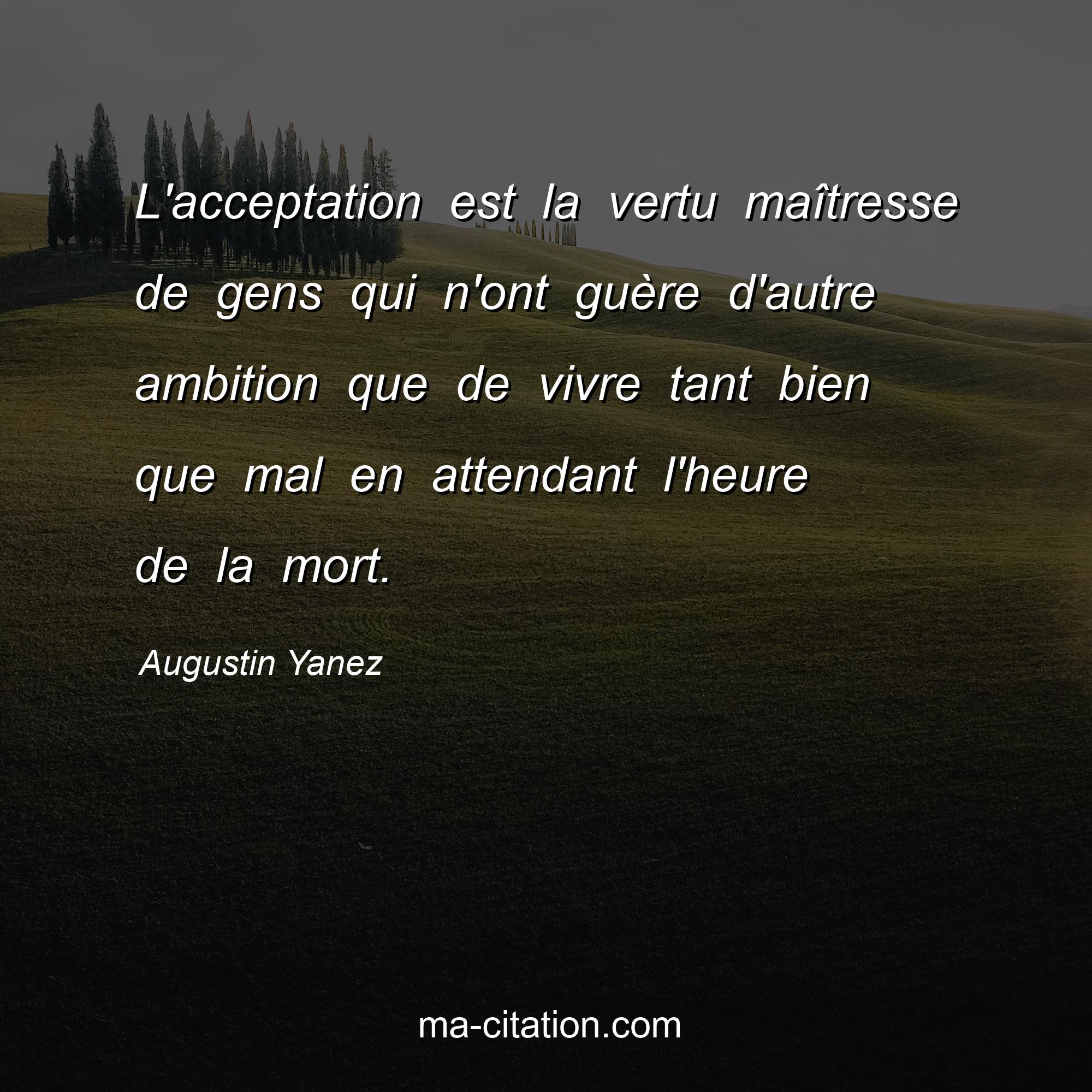 Augustin Yanez est l'auteur de la citation sur la vie "L'acceptation est la vertu maîtresse de gens qui n'ont guère d'autre ambition que de vivre tant bien que mal en attendant l'heure de la mort.".