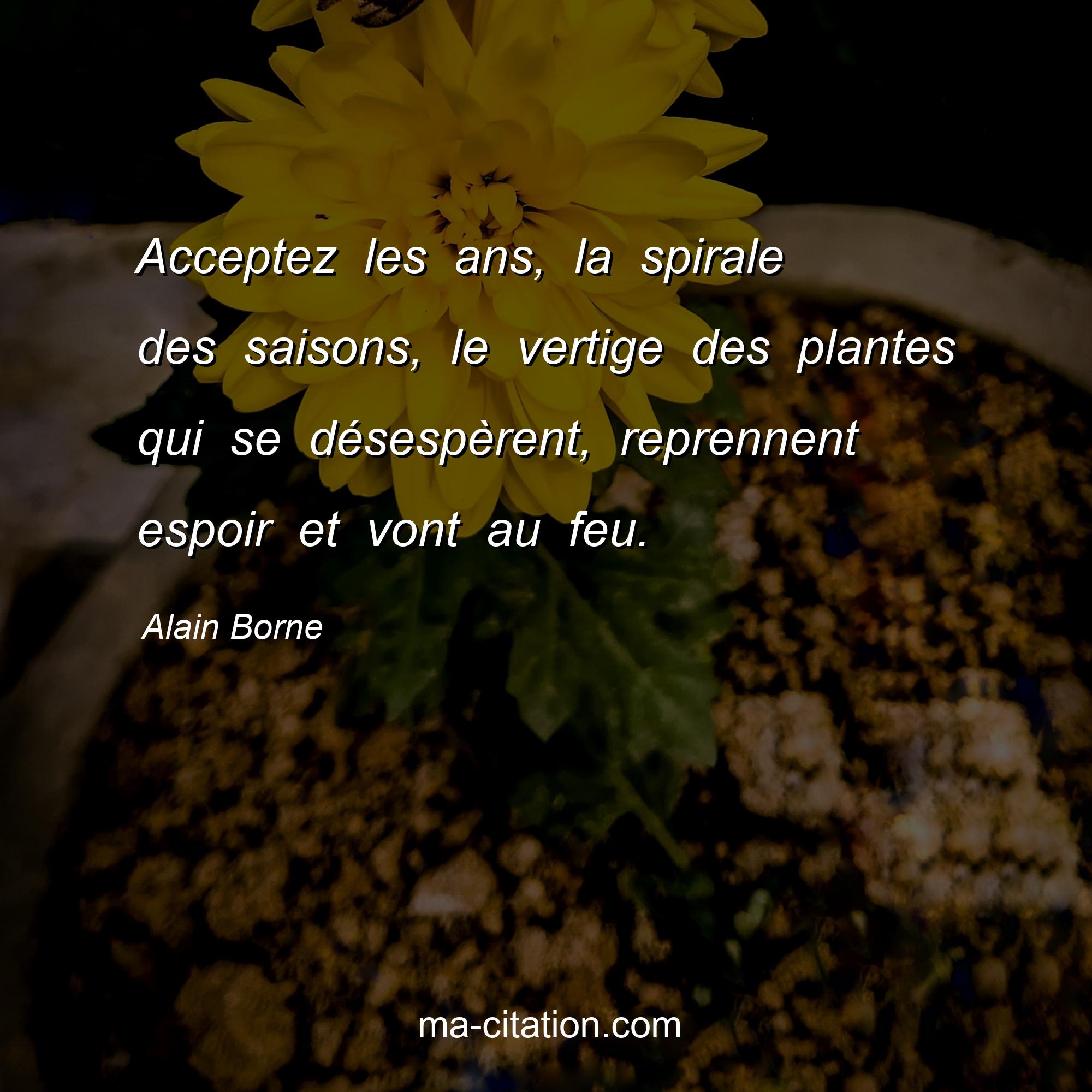 Alain Borne est l'auteur de la citation sur la vie "Acceptez les ans, la spirale des saisons, le vertige des plantes qui se désespèrent, reprennent espoir et vont au feu.".