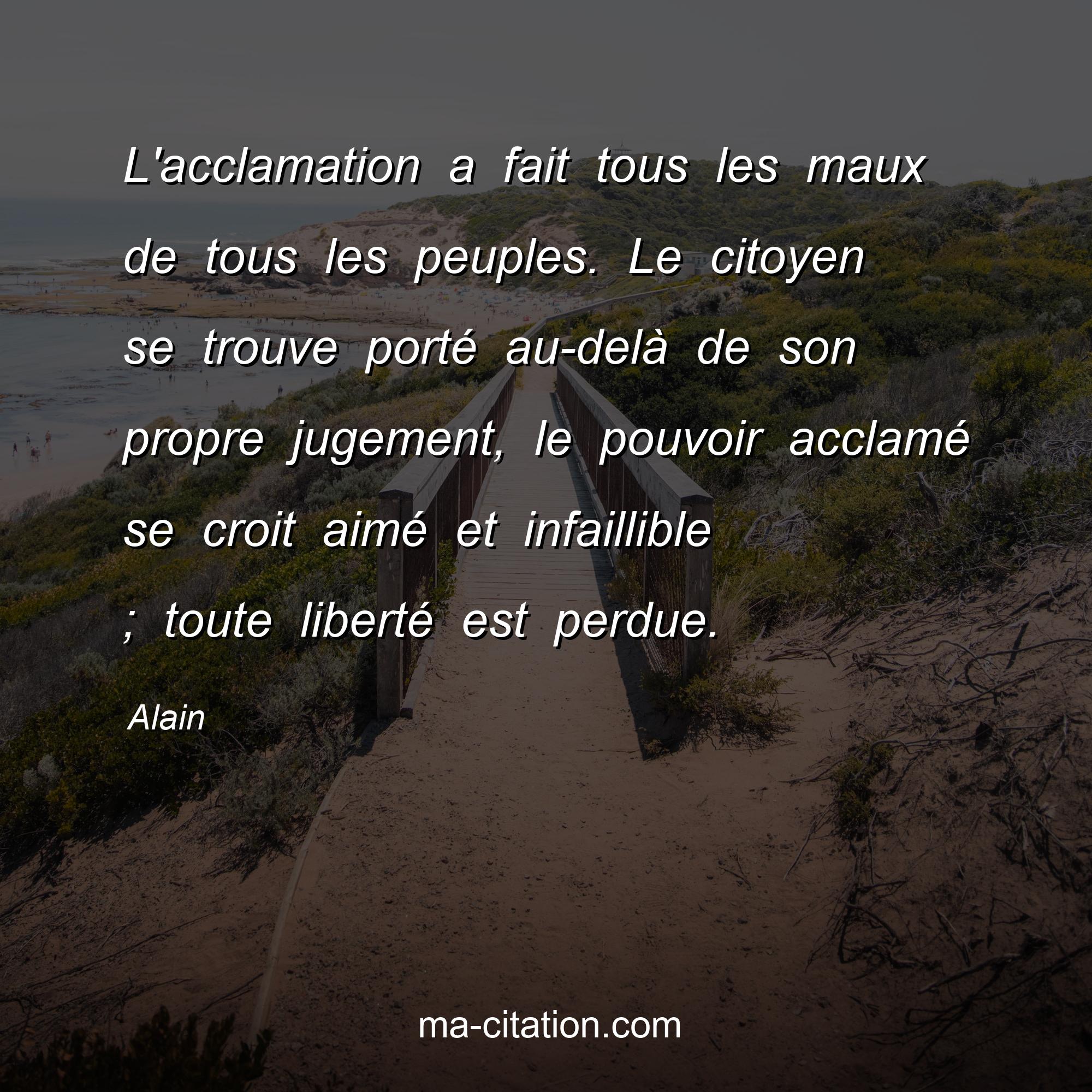 Citation sur la vie d'Alain :L'acclamation a fait tous les maux de tous les peuples. Le citoyen se trouve porté au-delà de son propre jugement, le pouvoir acclamé se croit aimé et infaillible ; toute liberté est perdue.
