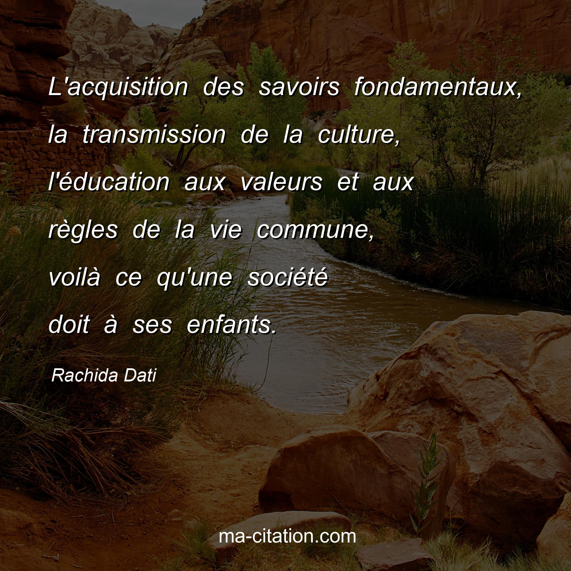 Rachida Dati est l'auteur de la citation sur la vie "L'acquisition des savoirs fondamentaux, la transmission de la culture, l'éducation aux valeurs et aux règles de la vie commune, voilà ce qu'une société doit à ses enfants.".