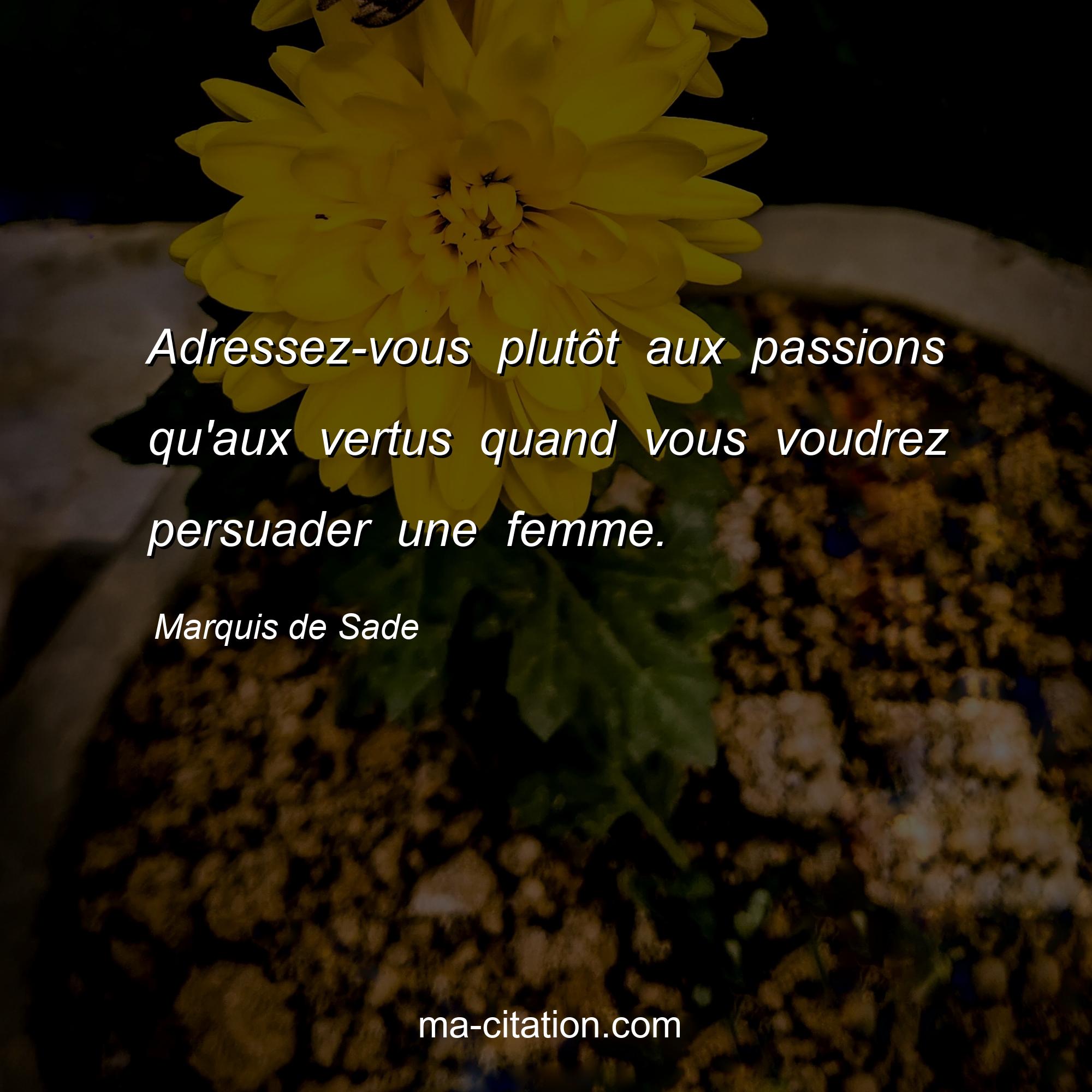 Citation sur la vie de Marquis de Sade :Adressez-vous plutôt aux passions qu'aux vertus quand vous voudrez persuader une femme.