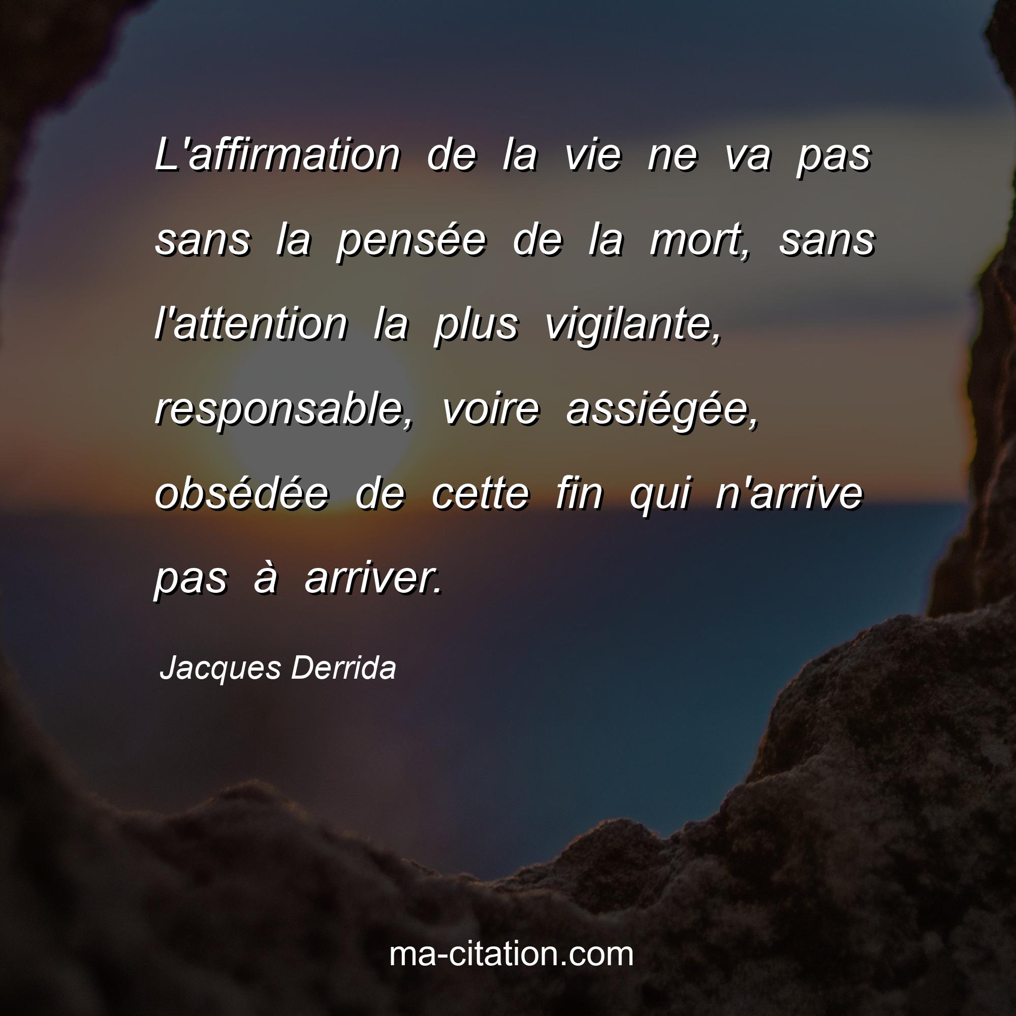 Citation sur la vie de Jacques Derrida :L'affirmation de la vie ne va pas sans la pensée de la mort, sans l'attention la plus vigilante, responsable, voire assiégée, obsédée de cette fin qui n'arrive pas à arriver.