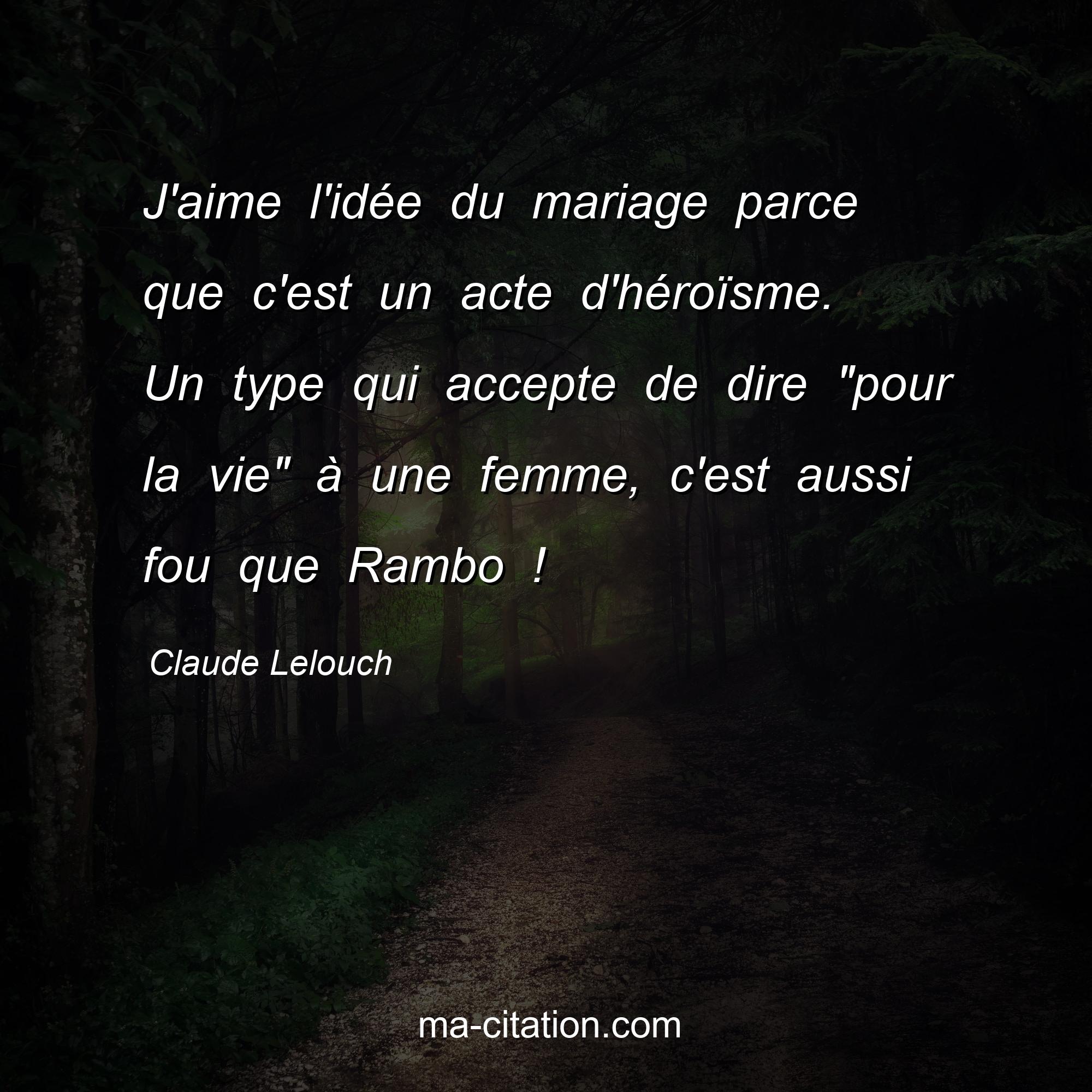 Citation sur la vie de Claude Lelouch :J'aime l'idée du mariage parce que c'est un acte d'héroïsme. Un type qui accepte de dire "pour la vie" à une femme, c'est aussi fou que Rambo !