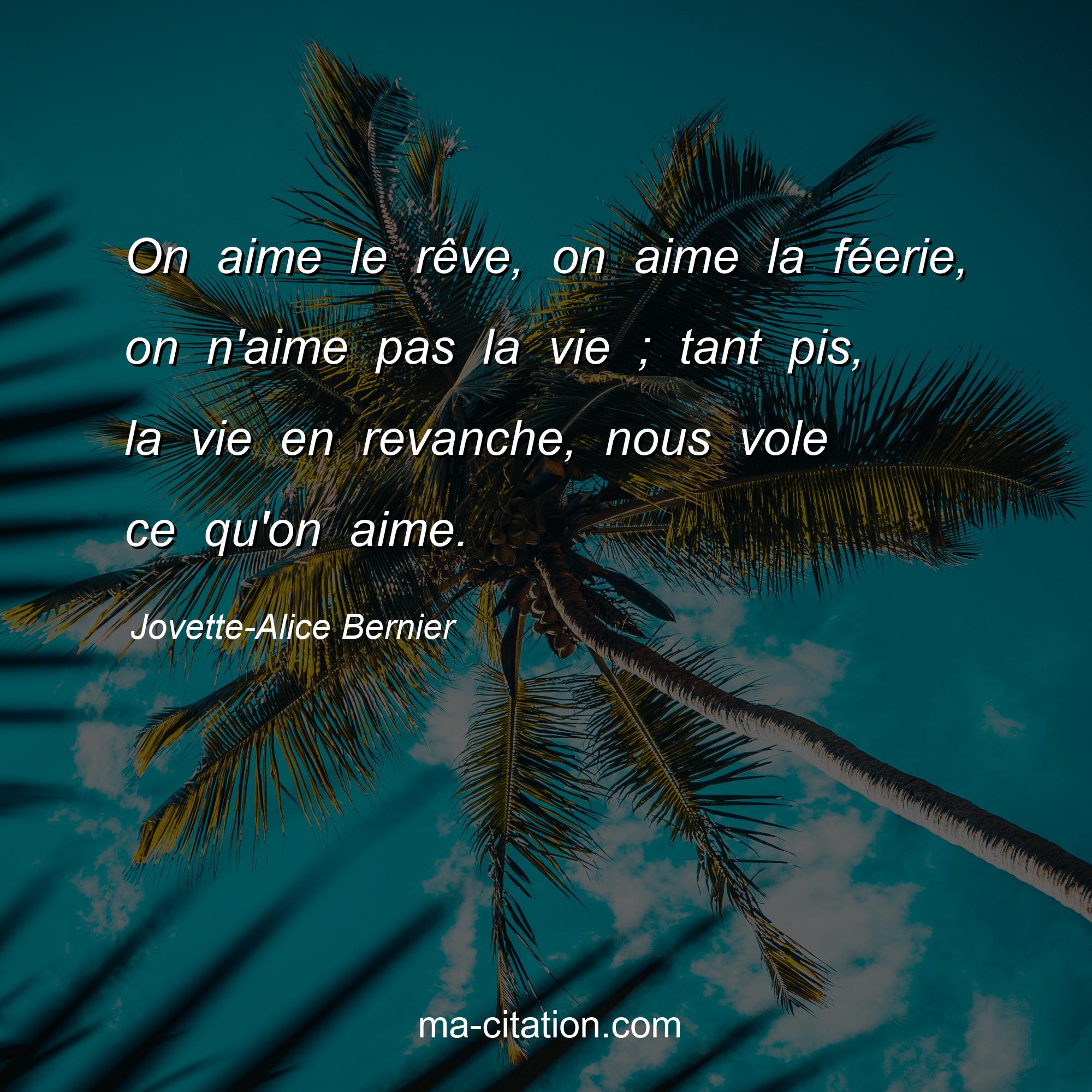 Citation sur la vie de Jovette-Alice Bernier :On aime le rêve, on aime la féerie, on n'aime pas la vie ; tant pis, la vie en revanche, nous vole ce qu'on aime.