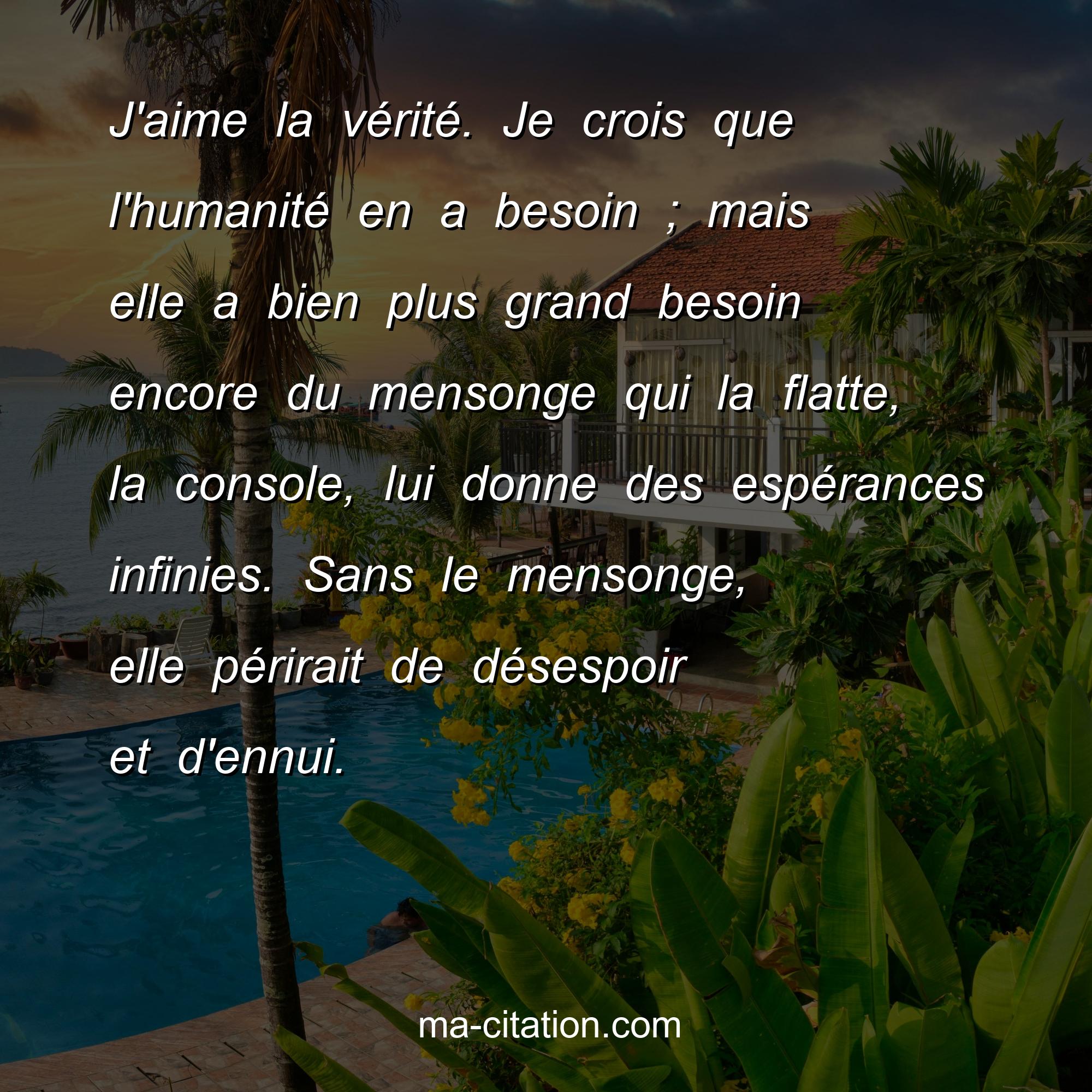 J'aime la vérité. Je crois que l'humanité en a besoin ; mais elle a bien plus grand besoin encore du mensonge qui la flatte, la console, lui donne des espérances infinies. Sans le mensonge, elle périrait de désespoir et d'ennui.