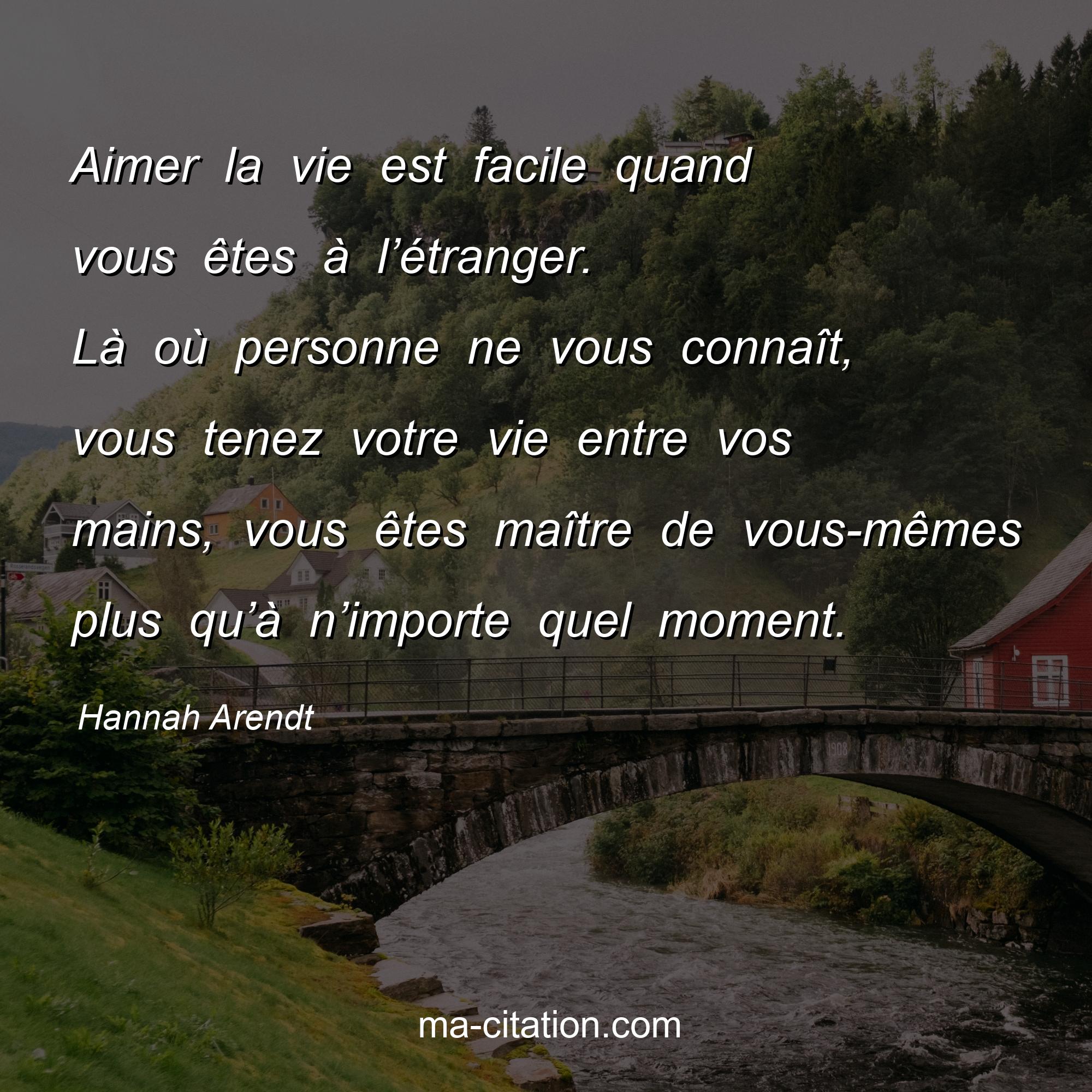 Citation sur la vie de Hannah Arendt :Aimer la vie est facile quand vous êtes à l’étranger. Là où personne ne vous connaît, vous tenez votre vie entre vos mains, vous êtes maître de vous-mêmes plus qu’à n’importe quel moment.