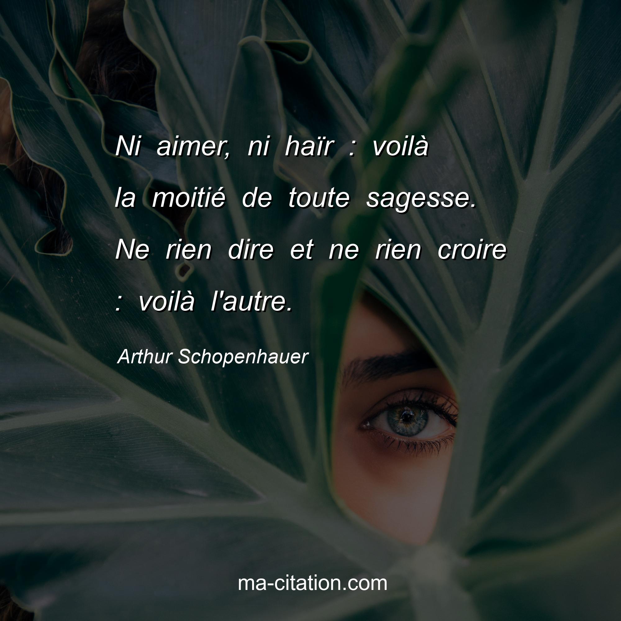 Citation sur la vie d'Arthur Schopenhauer :Ni aimer, ni haïr : voilà la moitié de toute sagesse. Ne rien dire et ne rien croire : voilà l'autre.