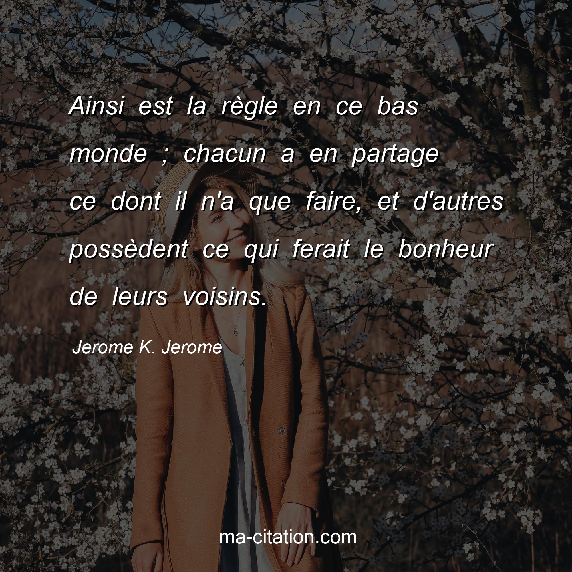 Citation sur la vie de Jerome K. Jerome :Ainsi est la règle en ce bas monde ; chacun a en partage ce dont il n'a que faire, et d'autres possèdent ce qui ferait le bonheur de leurs voisins.