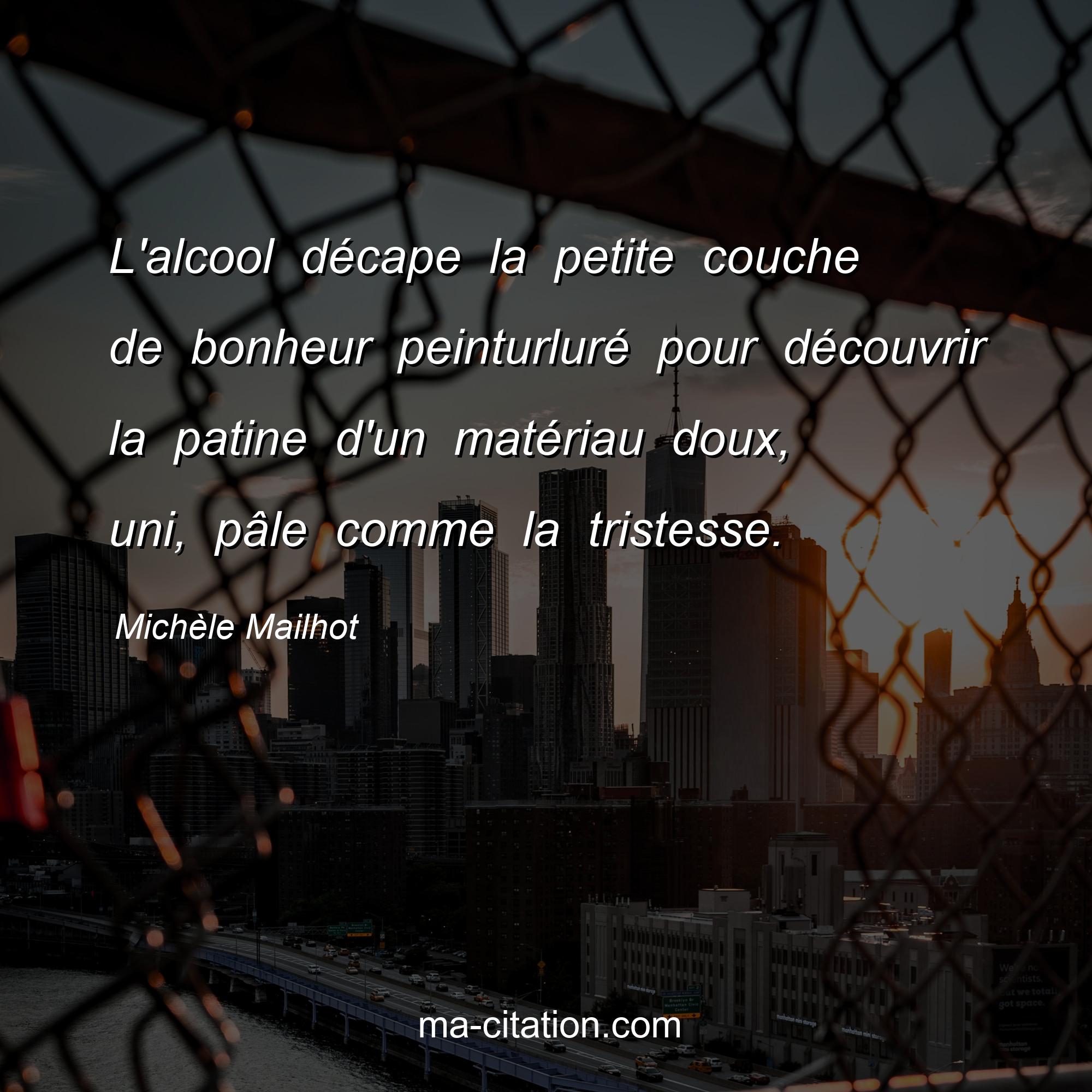 Michèle Mailhot est l'auteur de la citation sur la vie "L'alcool décape la petite couche de bonheur peinturluré pour découvrir la patine d'un matériau doux, uni, pâle comme la tristesse.".