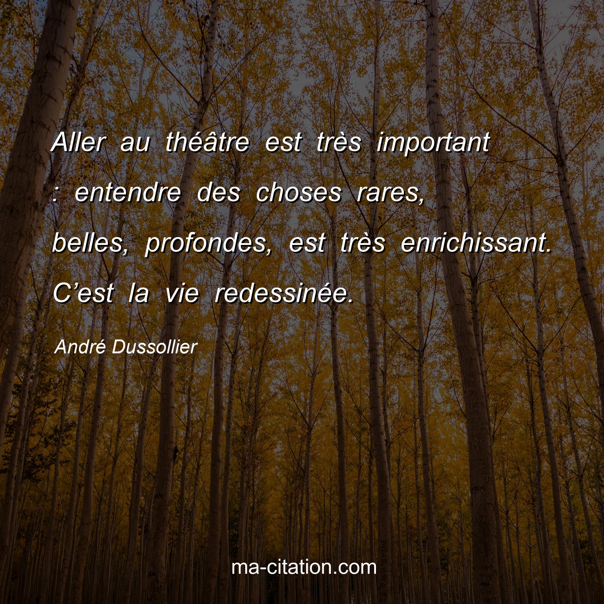Citation sur la vie d'André Dussollier :Aller au théâtre est très important : entendre des choses rares, belles, profondes, est très enrichissant. C’est la vie redessinée.