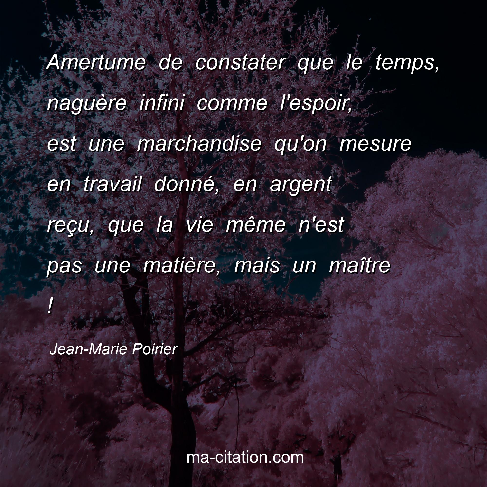 Jean-Marie Poirier est l'auteur de la citation sur la vie "Amertume de constater que le temps, naguère infini comme l'espoir, est une marchandise qu'on mesure en travail donné, en argent reçu, que la vie même n'est pas une matière, mais un maître !".