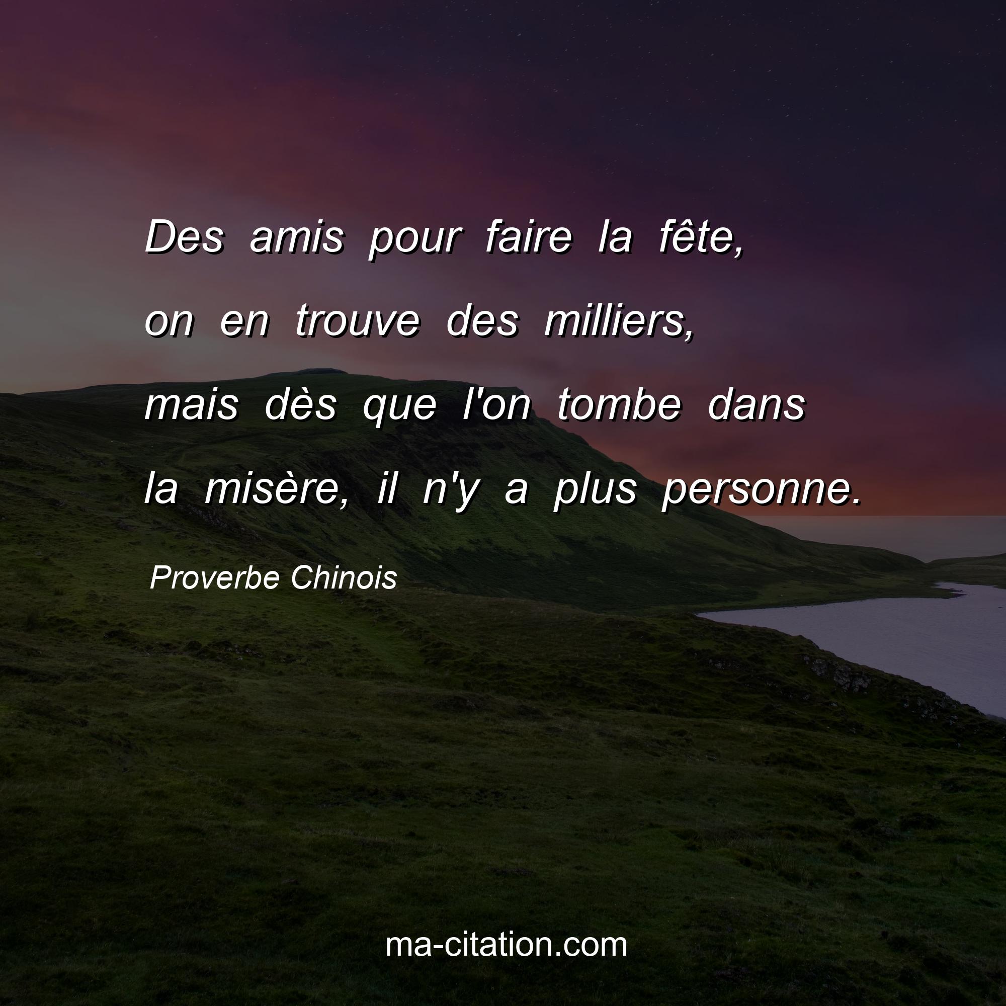 Proverbe Chinois sur la vie :Des amis pour faire la fête, on en trouve des milliers, mais dès que l'on tombe dans la misère, il n'y a plus personne.