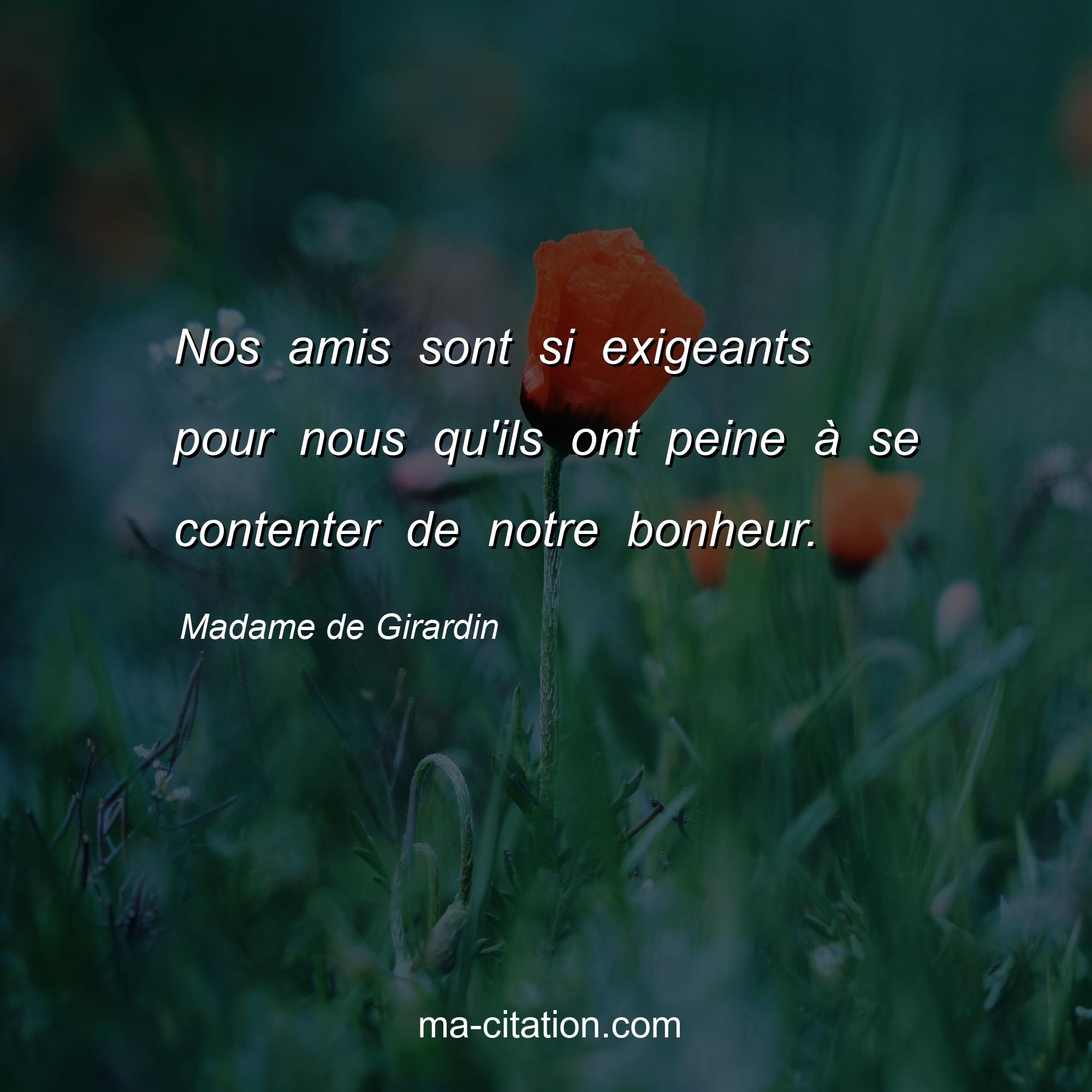 Citation sur la vie de Madame de Girardin :Nos amis sont si exigeants pour nous qu'ils ont peine à se contenter de notre bonheur.