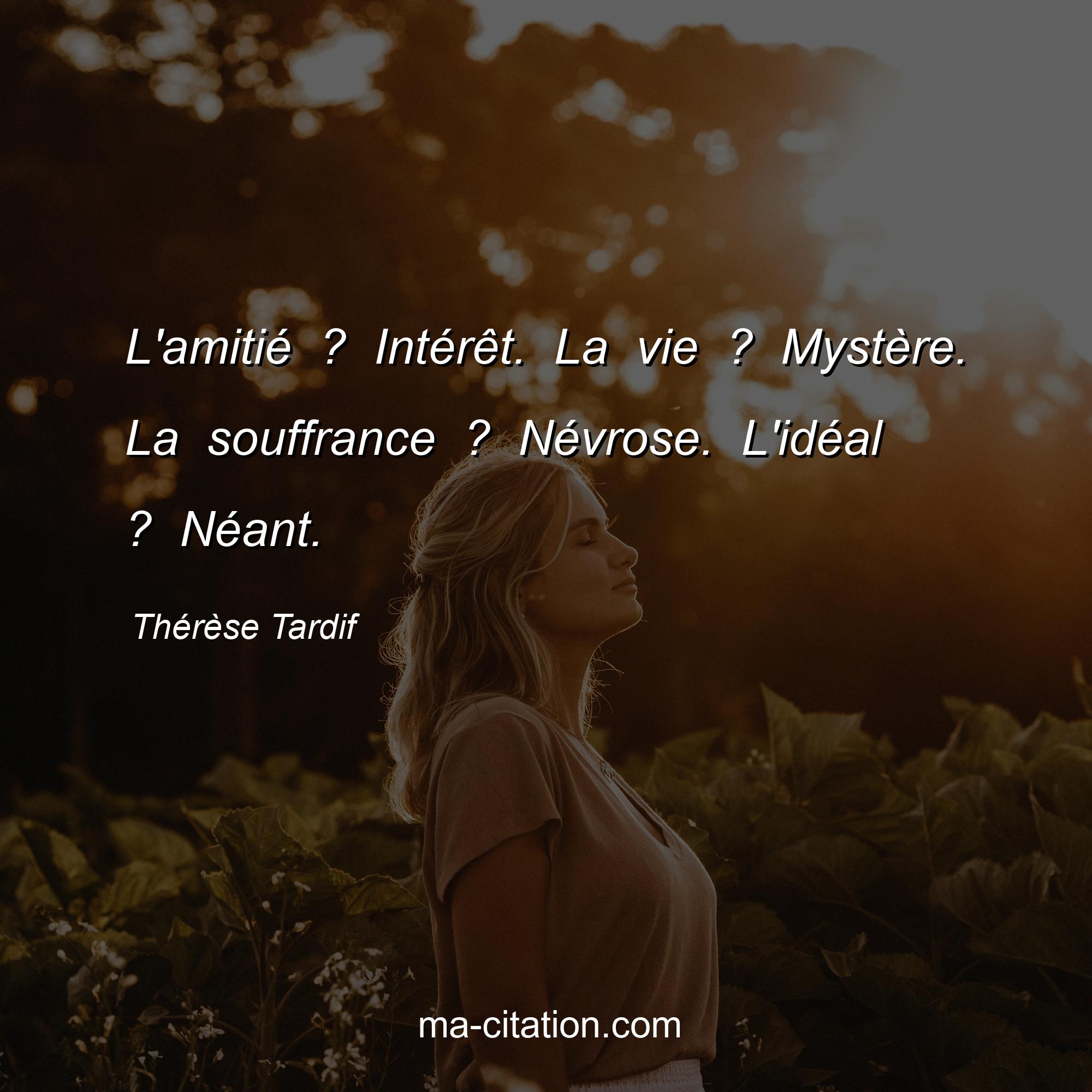 Thérèse Tardif est l'auteur de la citation sur la vie "L'amitié ? Intérêt. La vie ? Mystère. La souffrance ? Névrose. L'idéal ? Néant.".