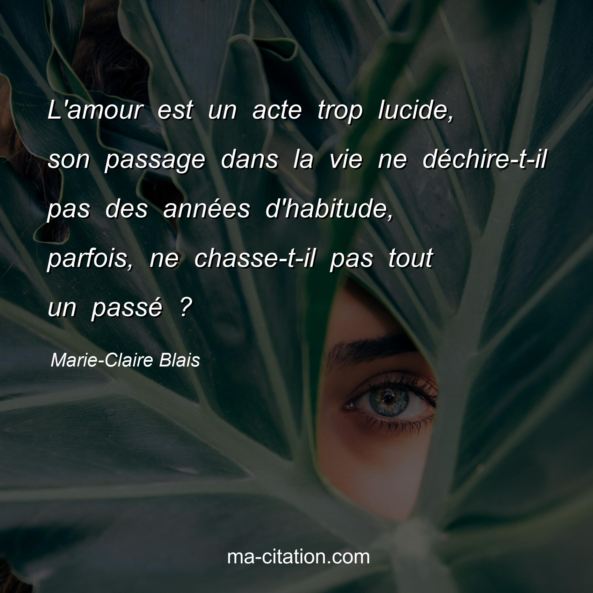 Citation sur la vie de Marie-Claire Blais :L'amour est un acte trop lucide, son passage dans la vie ne déchire-t-il pas des années d'habitude, parfois, ne chasse-t-il pas tout un passé ?