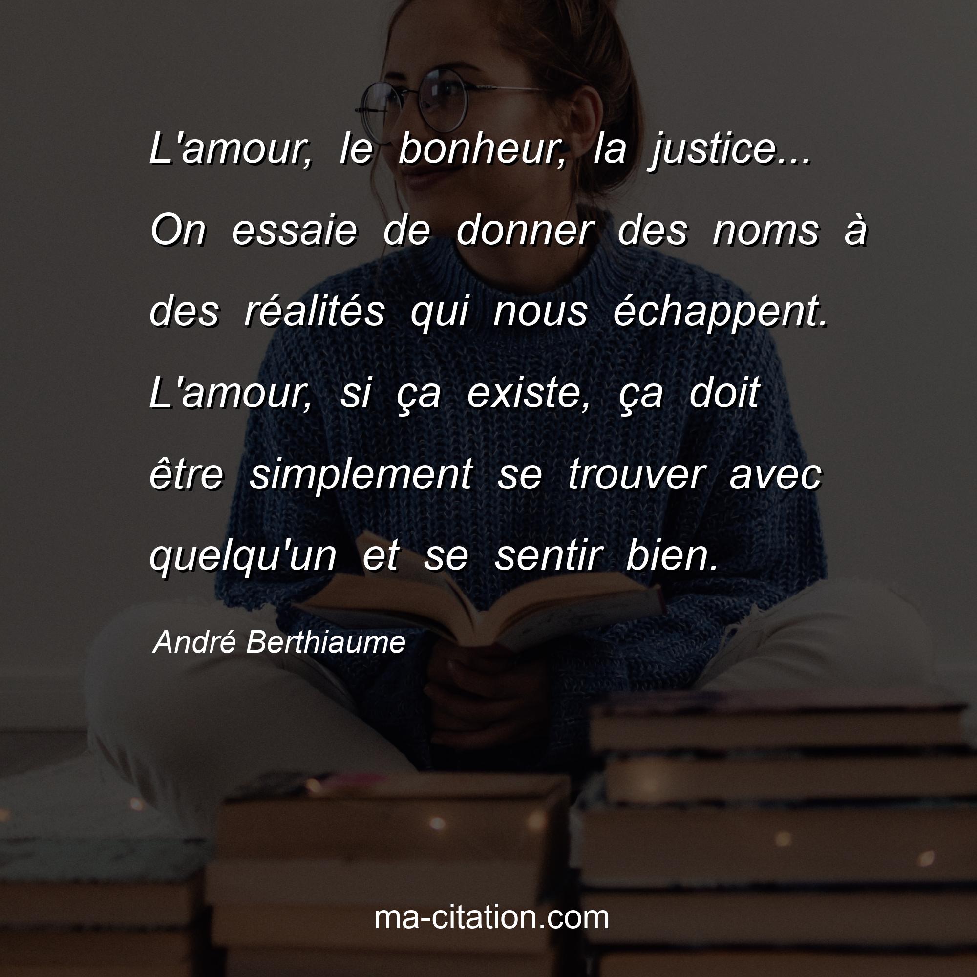 Citation sur la vie d'André Berthiaume :L'amour, le bonheur, la justice... On essaie de donner des noms à des réalités qui nous échappent. L'amour, si ça existe, ça doit être simplement se trouver avec quelqu'un et se sentir bien.