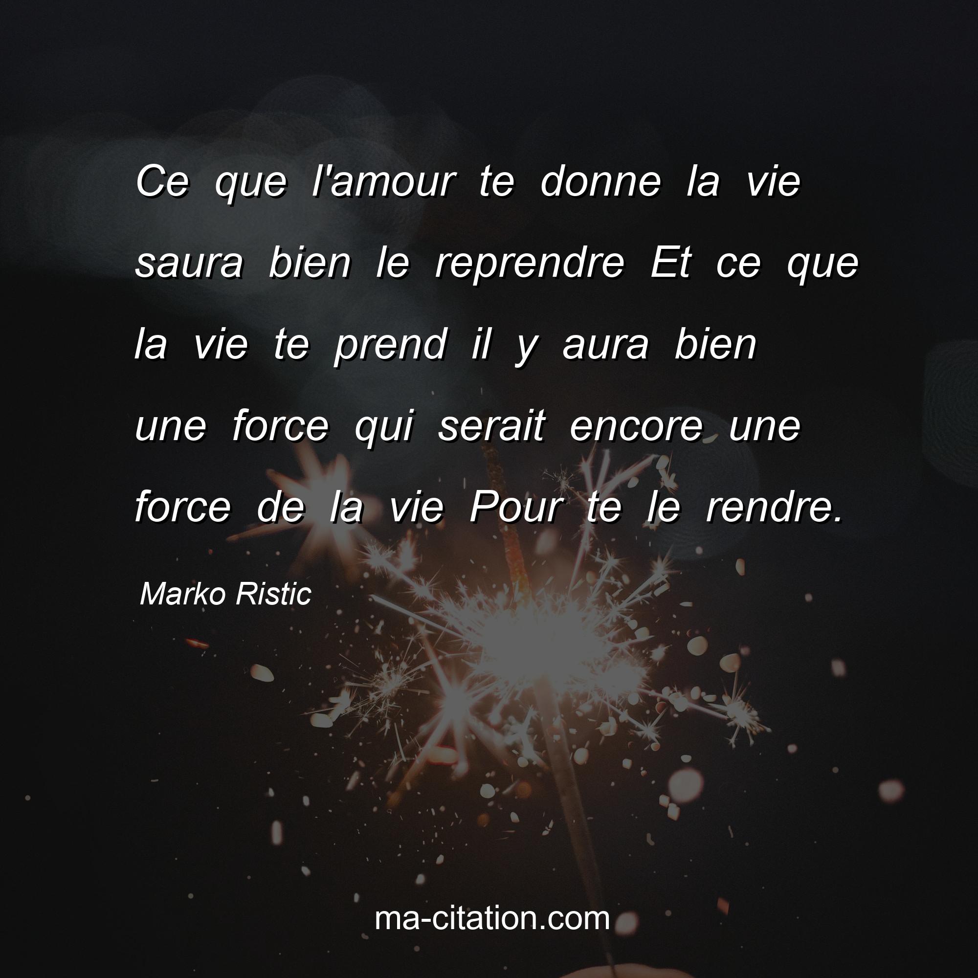 Citation sur la vie de Marko Ristic :Ce que l'amour te donne la vie saura bien le reprendre Et ce que la vie te prend il y aura bien une force qui serait encore une force de la vie Pour te le rendre.