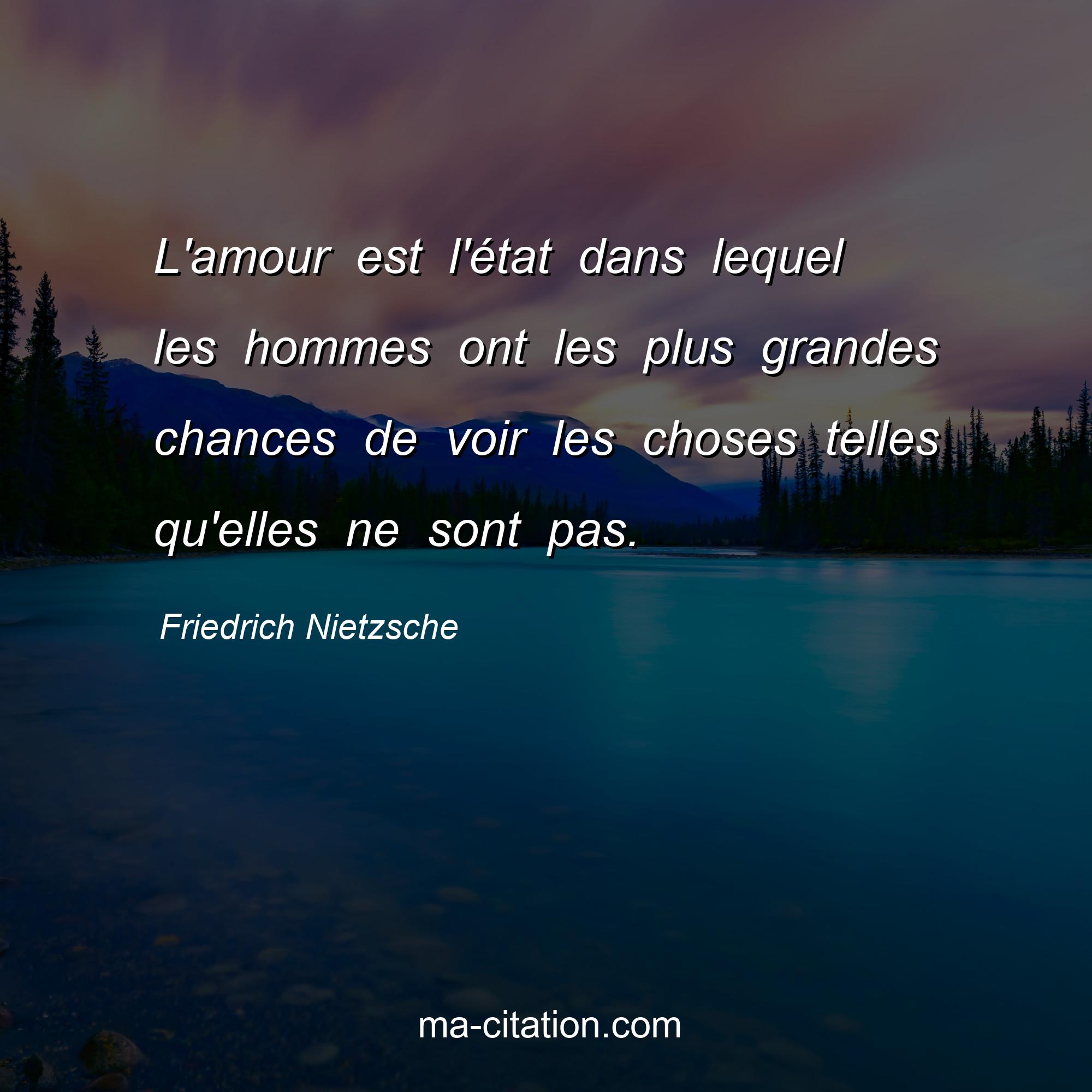 Citation sur la vie de Friedrich Nietzsche :L'amour est l'état dans lequel les hommes ont les plus grandes chances de voir les choses telles qu'elles ne sont pas.