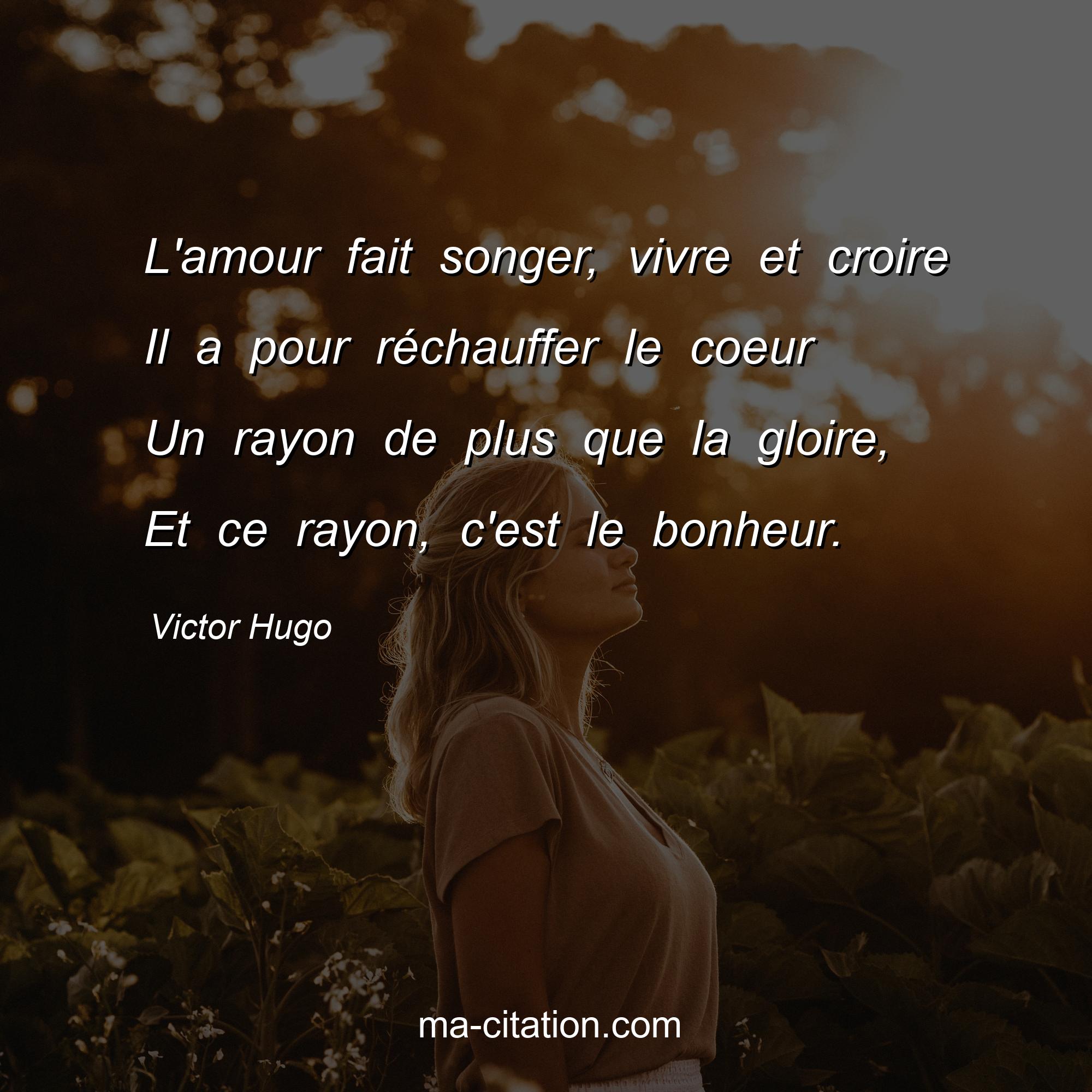Citation sur la vie de Victor Hugo :L'amour fait songer, vivre et croire Il a pour réchauffer le coeur Un rayon de plus que la gloire, Et ce rayon, c'est le bonheur.