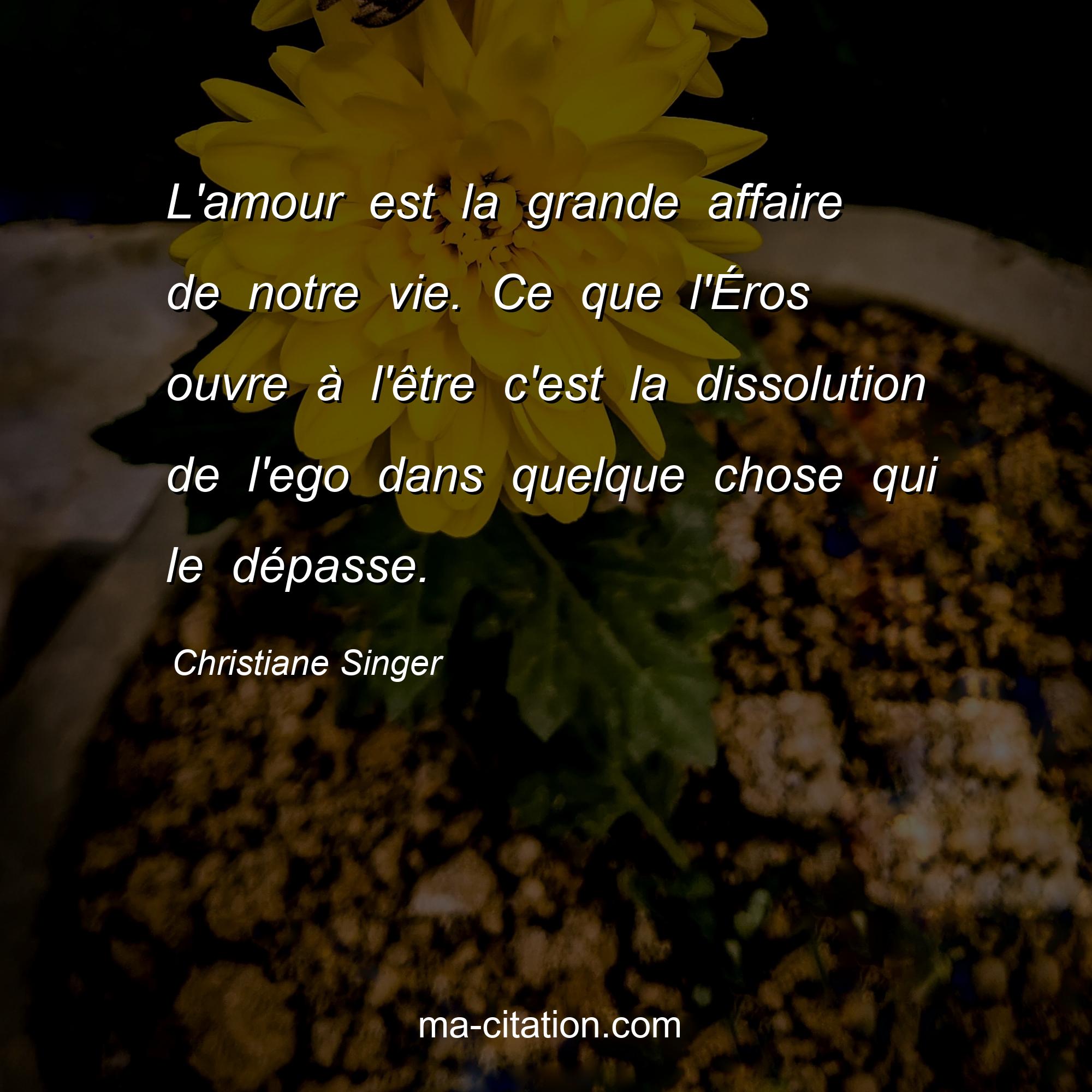 Citation sur la vie de Christiane Singer :L'amour est la grande affaire de notre vie. Ce que l'Éros ouvre à l'être c'est la dissolution de l'ego dans quelque chose qui le dépasse.