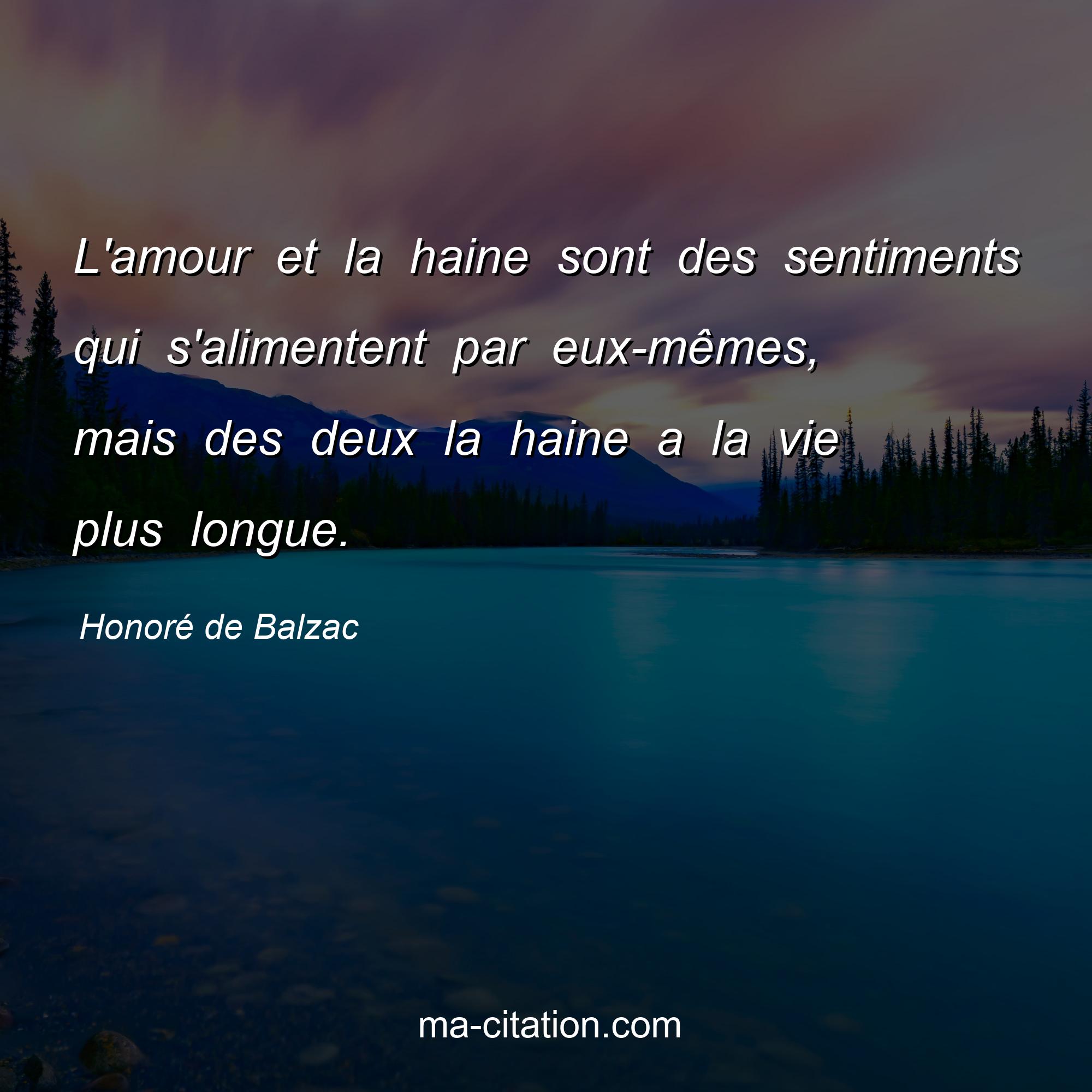 Citation sur la vie de Honoré de Balzac :L'amour et la haine sont des sentiments qui s'alimentent par eux-mêmes, mais des deux la haine a la vie plus longue.