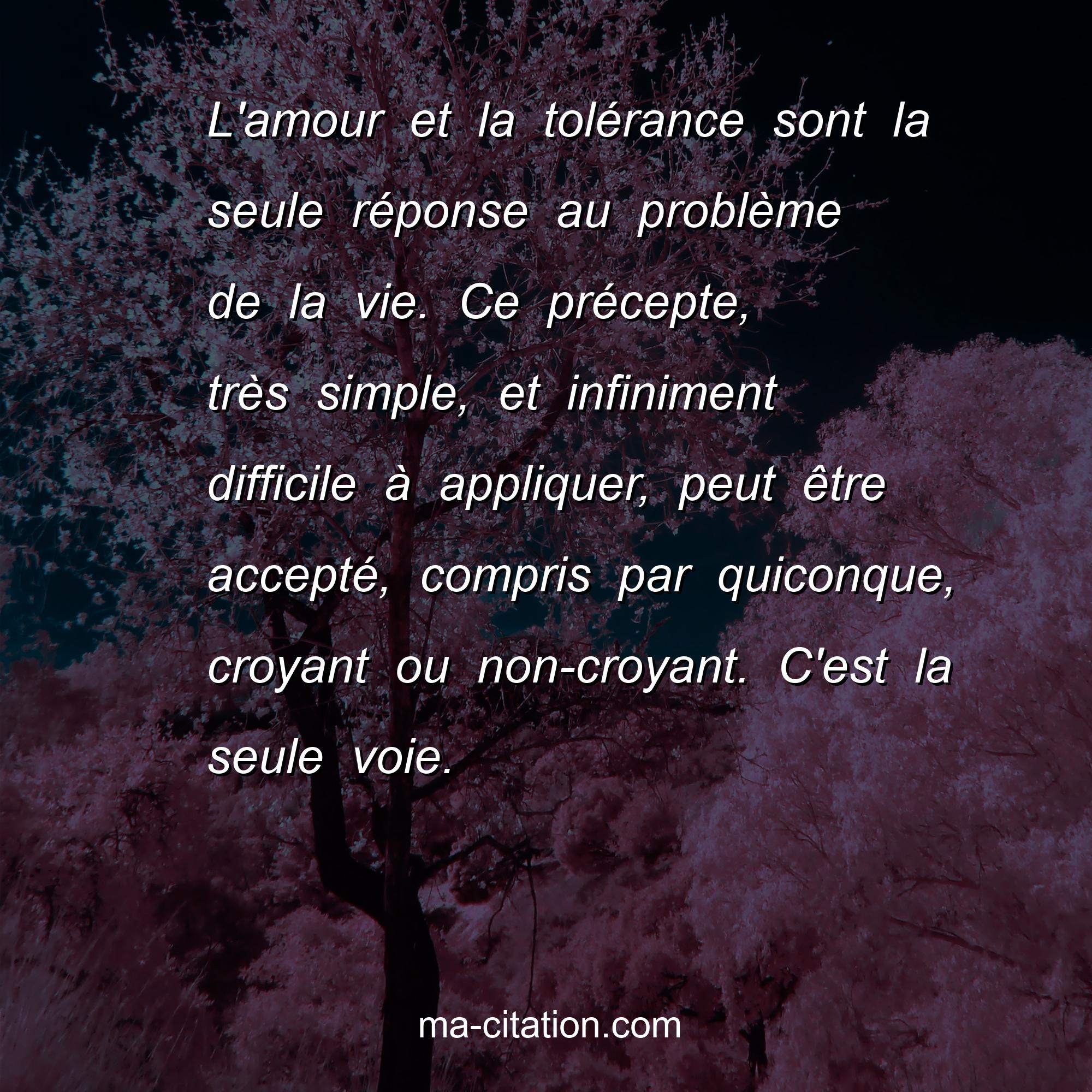 L'amour et la tolérance sont la seule réponse au problème de la vie. Ce précepte, très simple, et infiniment difficile à appliquer, peut être accepté, compris par quiconque, croyant ou non-croyant. C'est la seule voie.