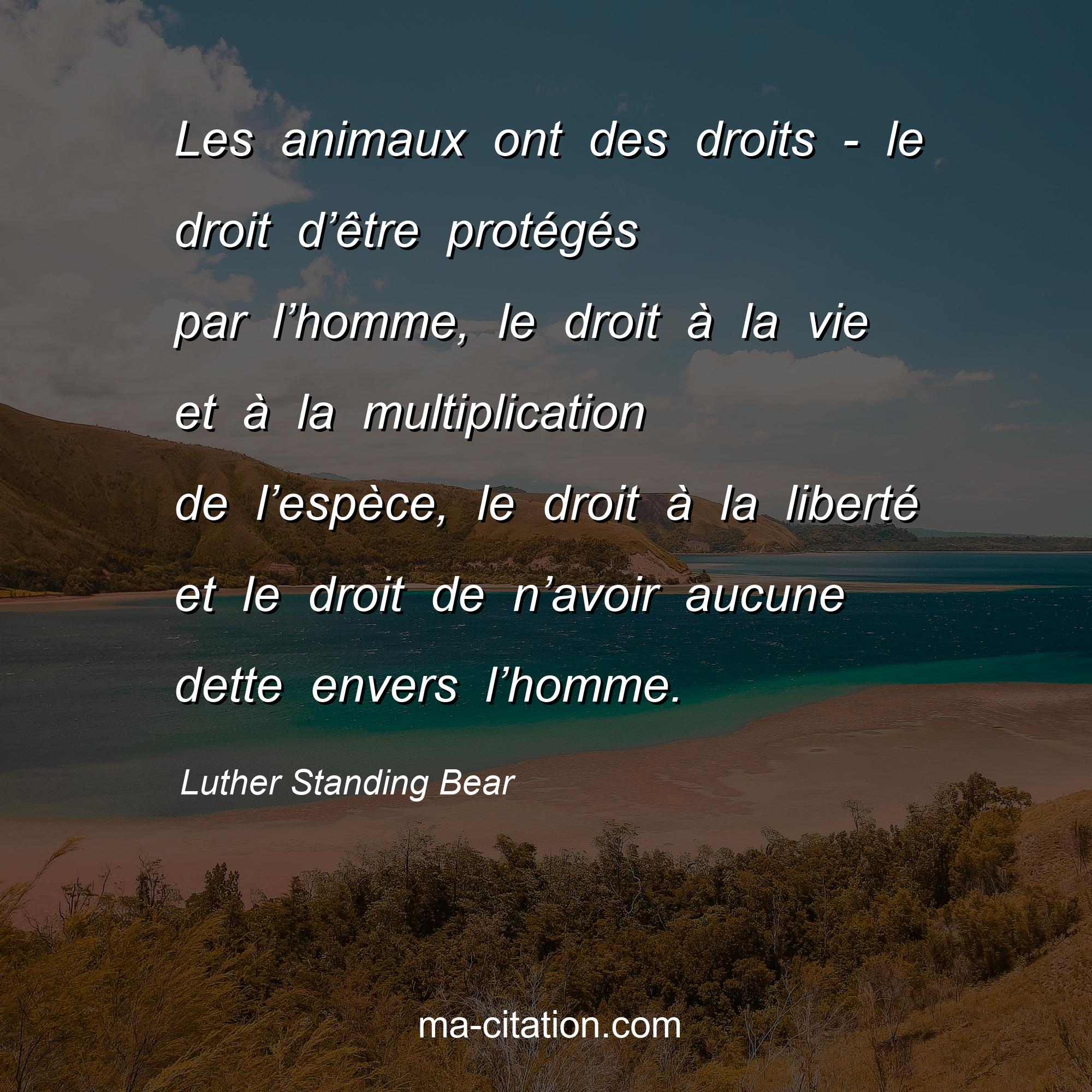 Citation sur la vie de Luther Standing Bear :Les animaux ont des droits - le droit d’être protégés par l’homme, le droit à la vie et à la multiplication de l’espèce, le droit à la liberté et le droit de n’avoir aucune dette envers l’homme.