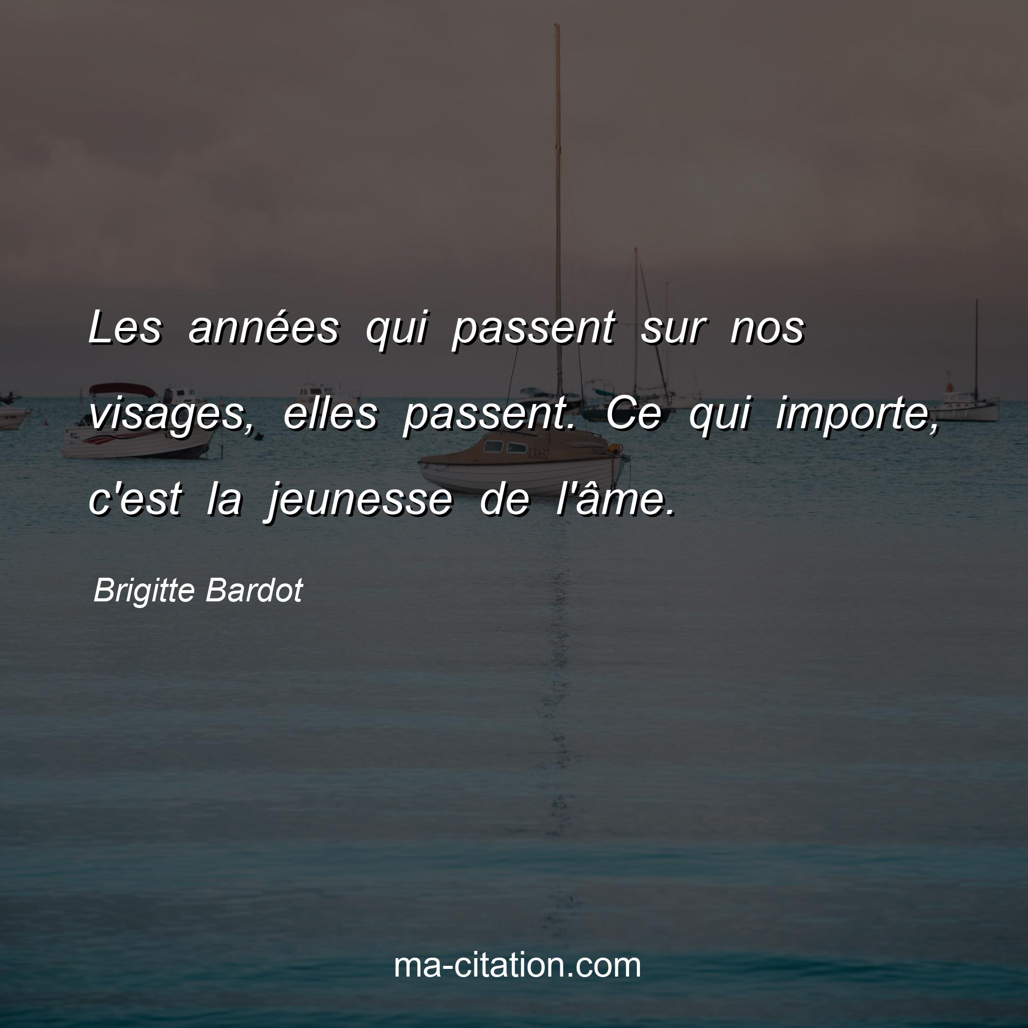 Citation sur la vie de Brigitte Bardot :Les années qui passent sur nos visages, elles passent. Ce qui importe, c'est la jeunesse de l'âme.