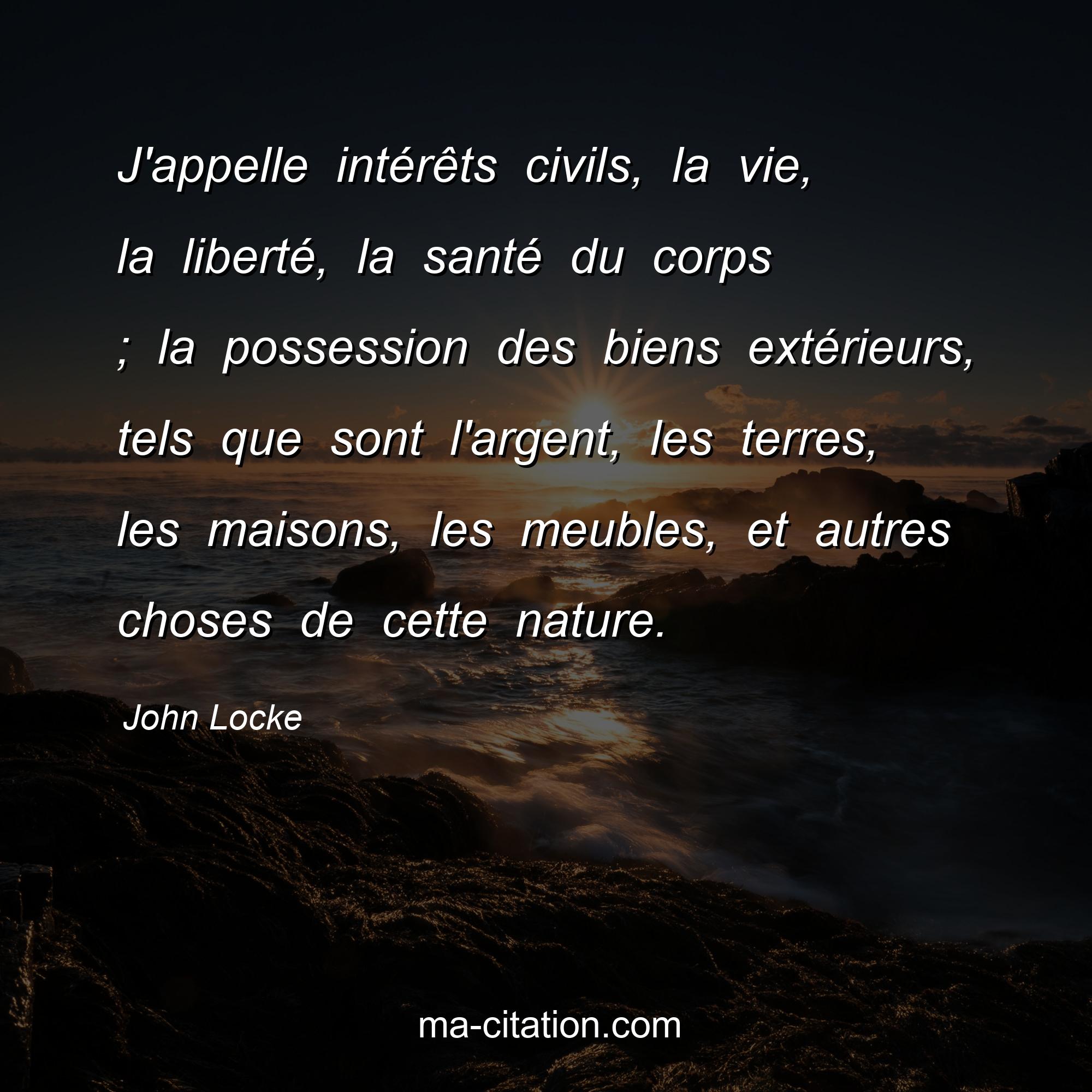 Citation sur la vie de John Locke :J'appelle intérêts civils, la vie, la liberté, la santé du corps ; la possession des biens extérieurs, tels que sont l'argent, les terres, les maisons, les meubles, et autres choses de cette nature.