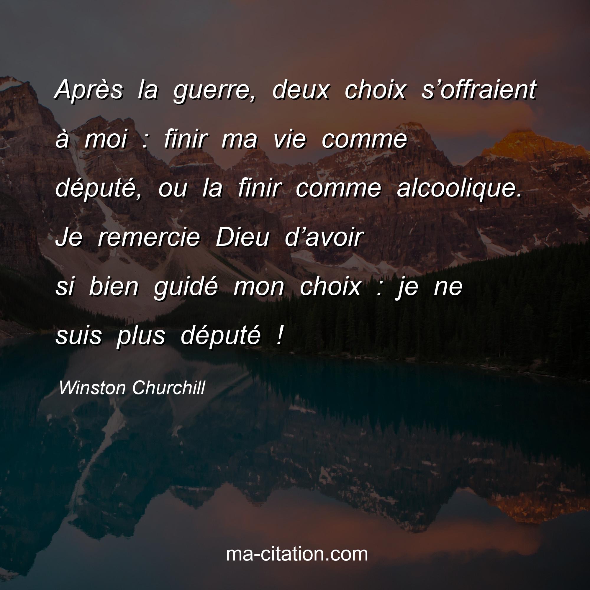 Citation sur la vie de Winston Churchill :Après la guerre, deux choix s’offraient à moi : finir ma vie comme député, ou la finir comme alcoolique. Je remercie Dieu d’avoir si bien guidé mon choix : je ne suis plus député !