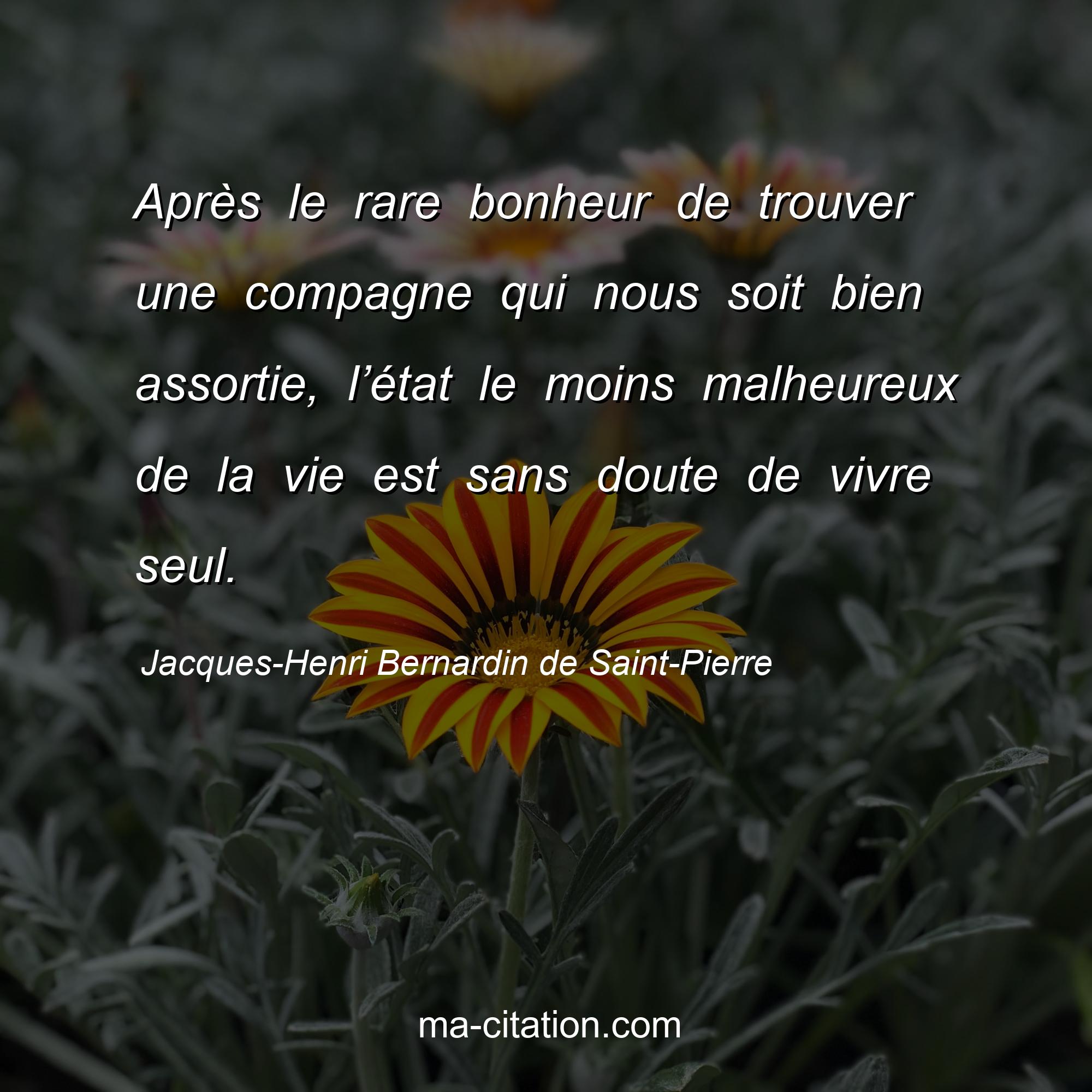 Citation sur la vie de Jacques-Henri Bernardin de Saint-Pierre :Après le rare bonheur de trouver une compagne qui nous soit bien assortie, l’état le moins malheureux de la vie est sans doute de vivre seul.
