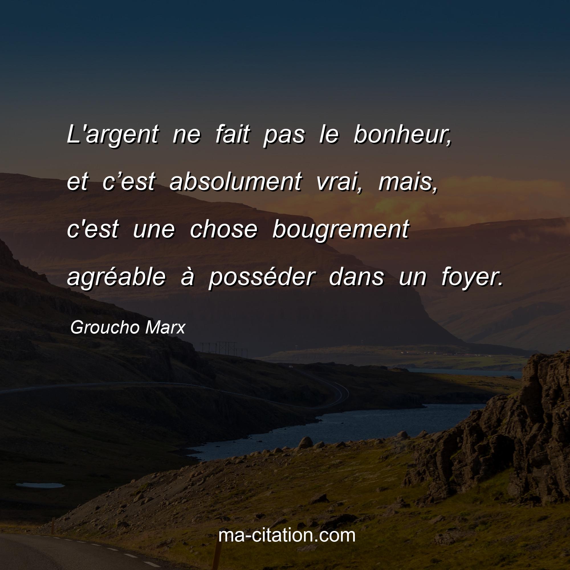 Citation sur la vie de Groucho Marx :L'argent ne fait pas le bonheur, et c’est absolument vrai, mais, c'est une chose bougrement agréable à posséder dans un foyer.