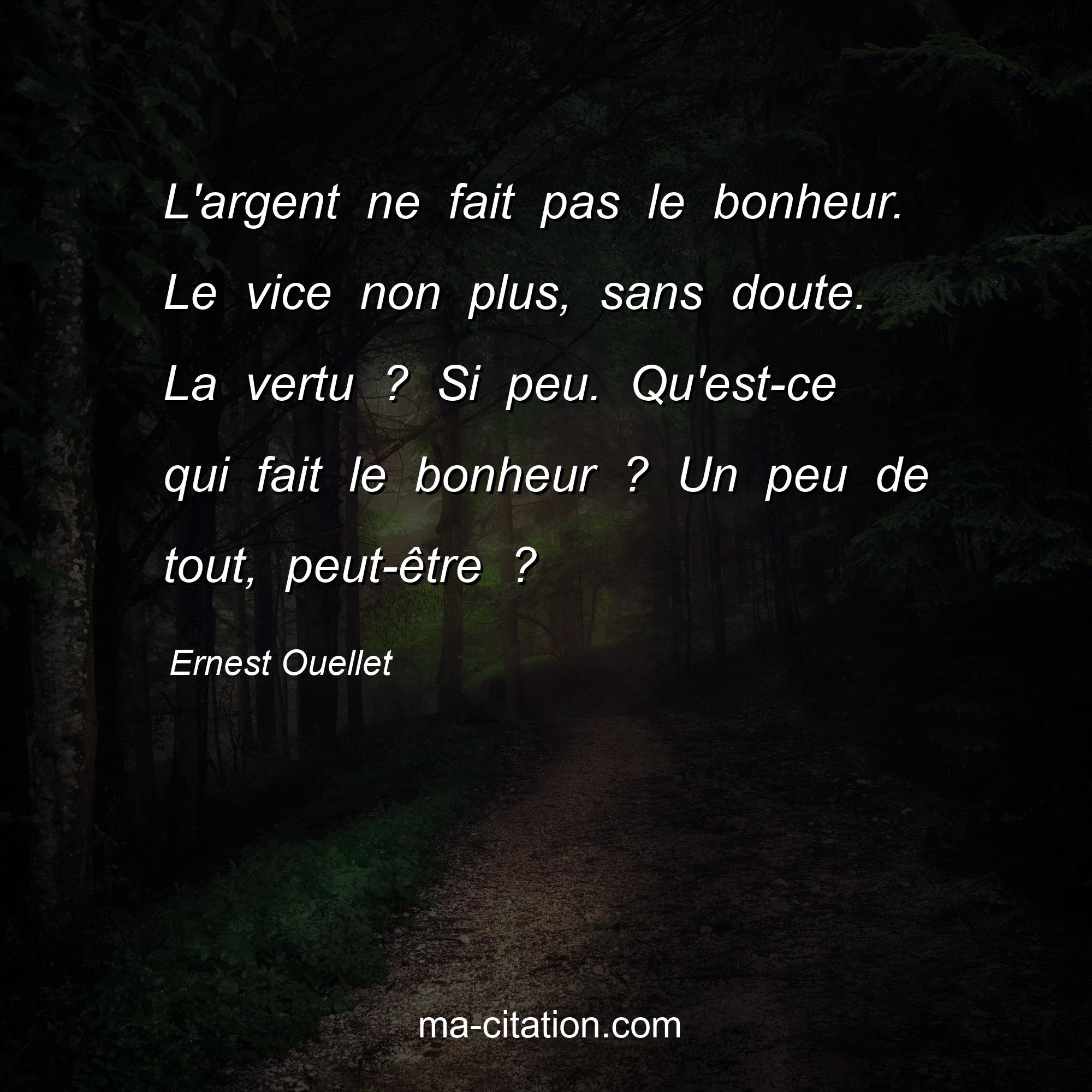 Ernest Ouellet est l'auteur de la citation sur la vie "L'argent ne fait pas le bonheur. Le vice non plus, sans doute. La vertu ? Si peu. Qu'est-ce qui fait le bonheur ? Un peu de tout, peut-être ?".