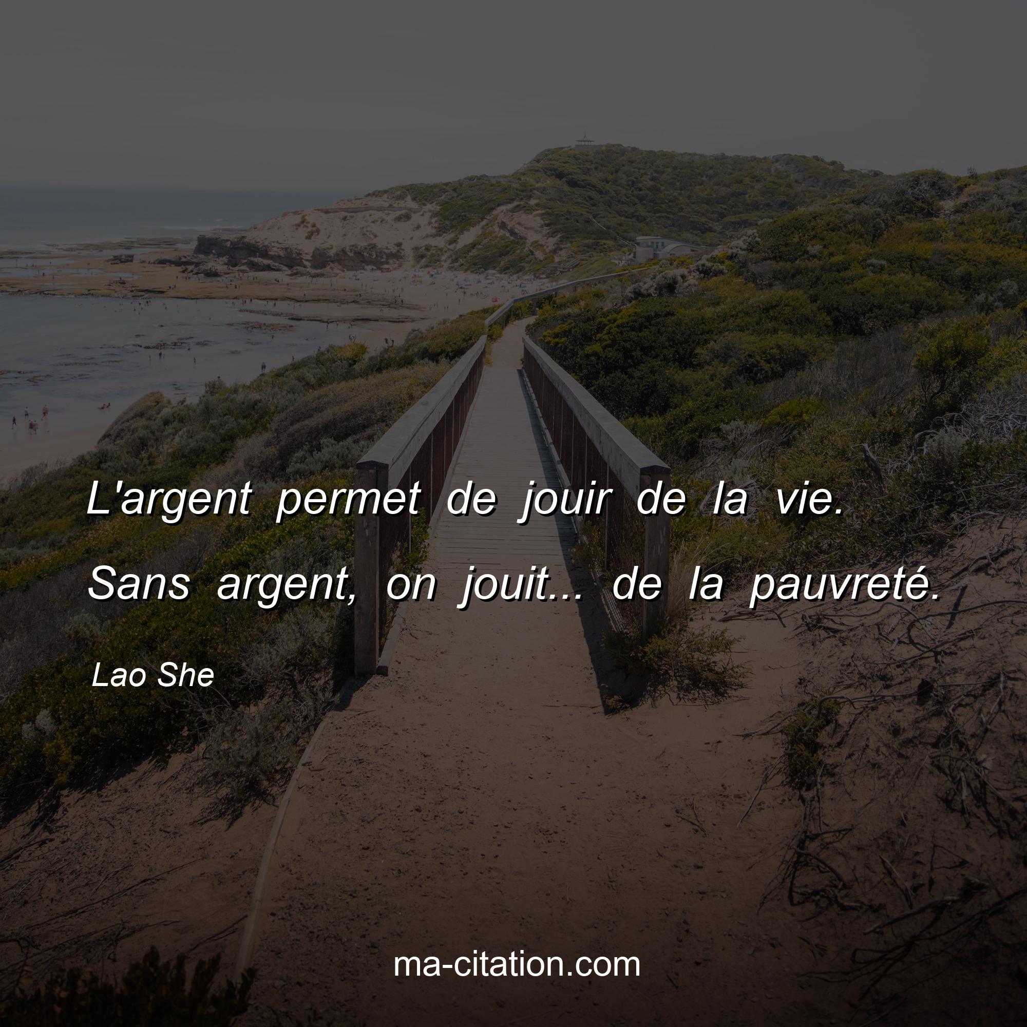 Lao She est l'auteur de la citation sur la vie "L'argent permet de jouir de la vie. Sans argent, on jouit... de la pauvreté.".