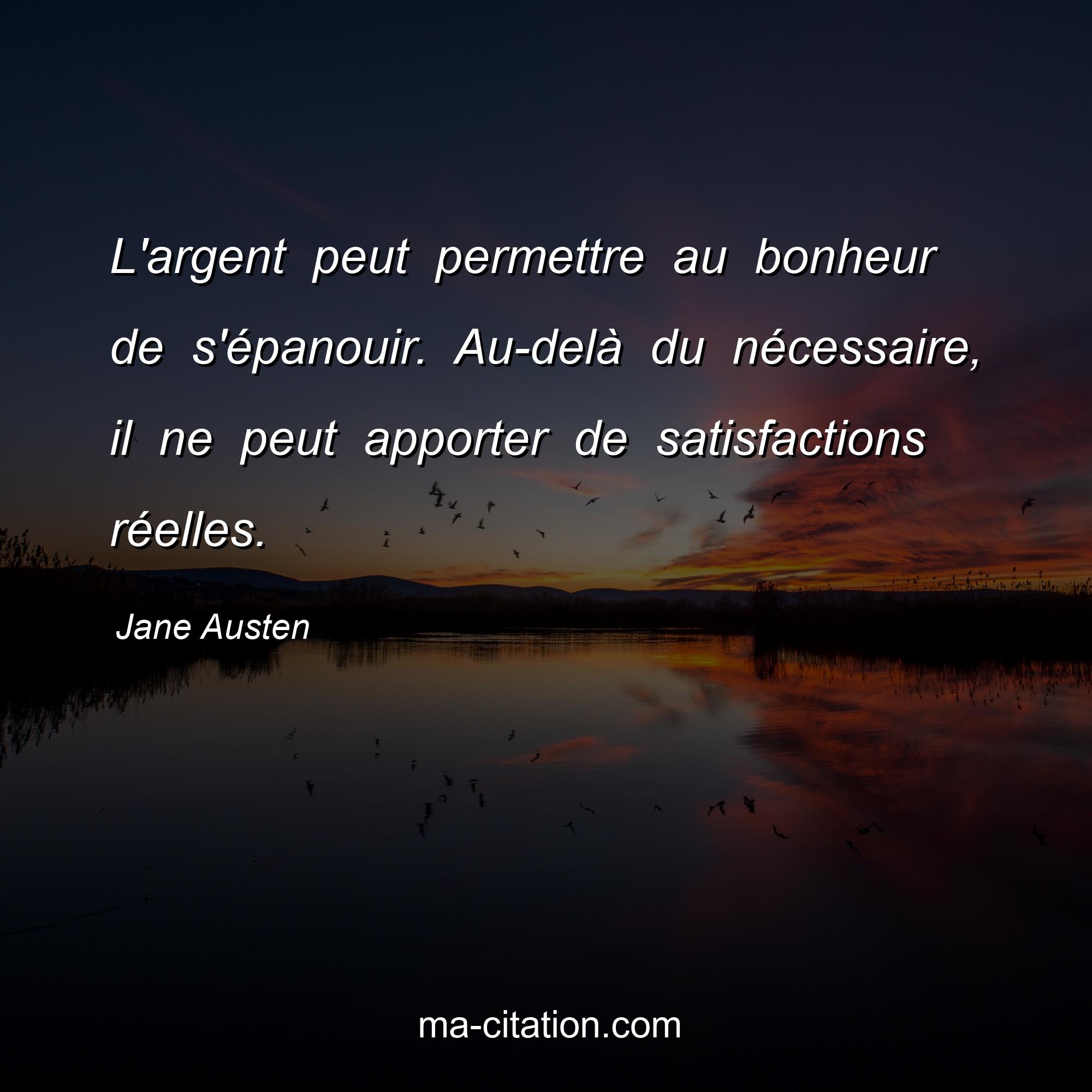 Citation sur la vie de Jane Austen :L'argent peut permettre au bonheur de s'épanouir. Au-delà du nécessaire, il ne peut apporter de satisfactions réelles.