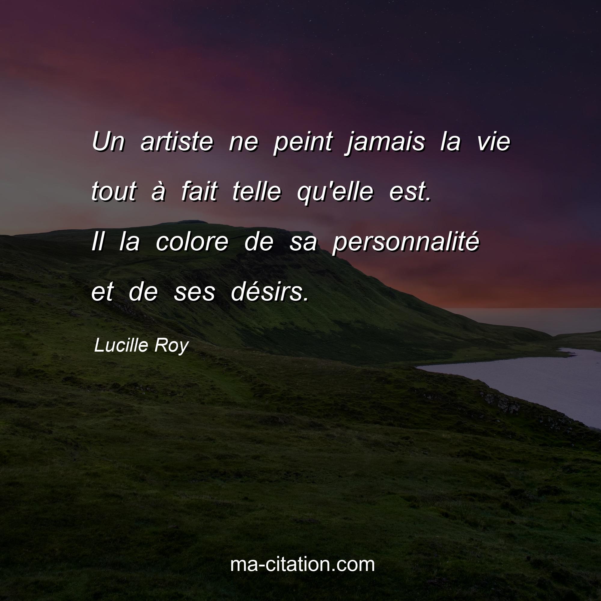 Citation sur la vie de Lucille Roy :Un artiste ne peint jamais la vie tout à fait telle qu'elle est. Il la colore de sa personnalité et de ses désirs.